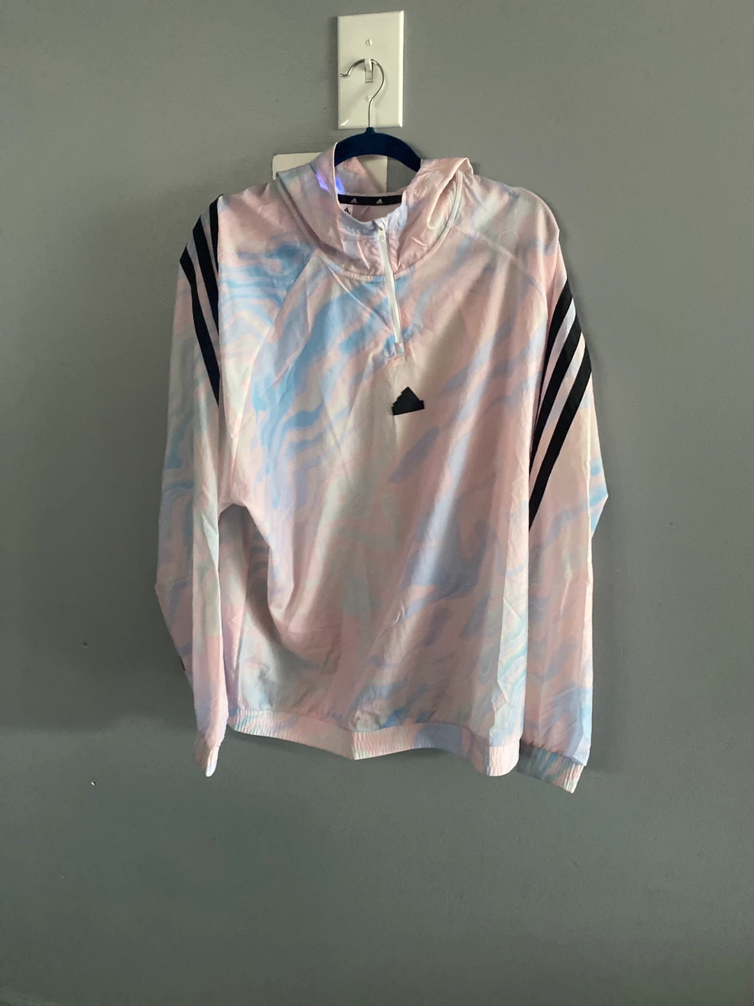 NWNT - Selling an Adidas pullover windbreaker jacket in size XL. The jacket features a unique pattern with pink and blue swirls, and the classic Adidas three stripes on the sleeves. It's in great condition and perfect for light weather!