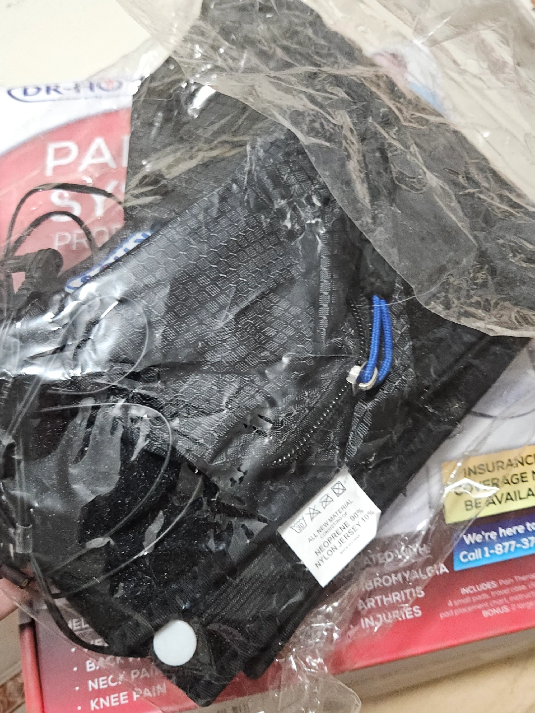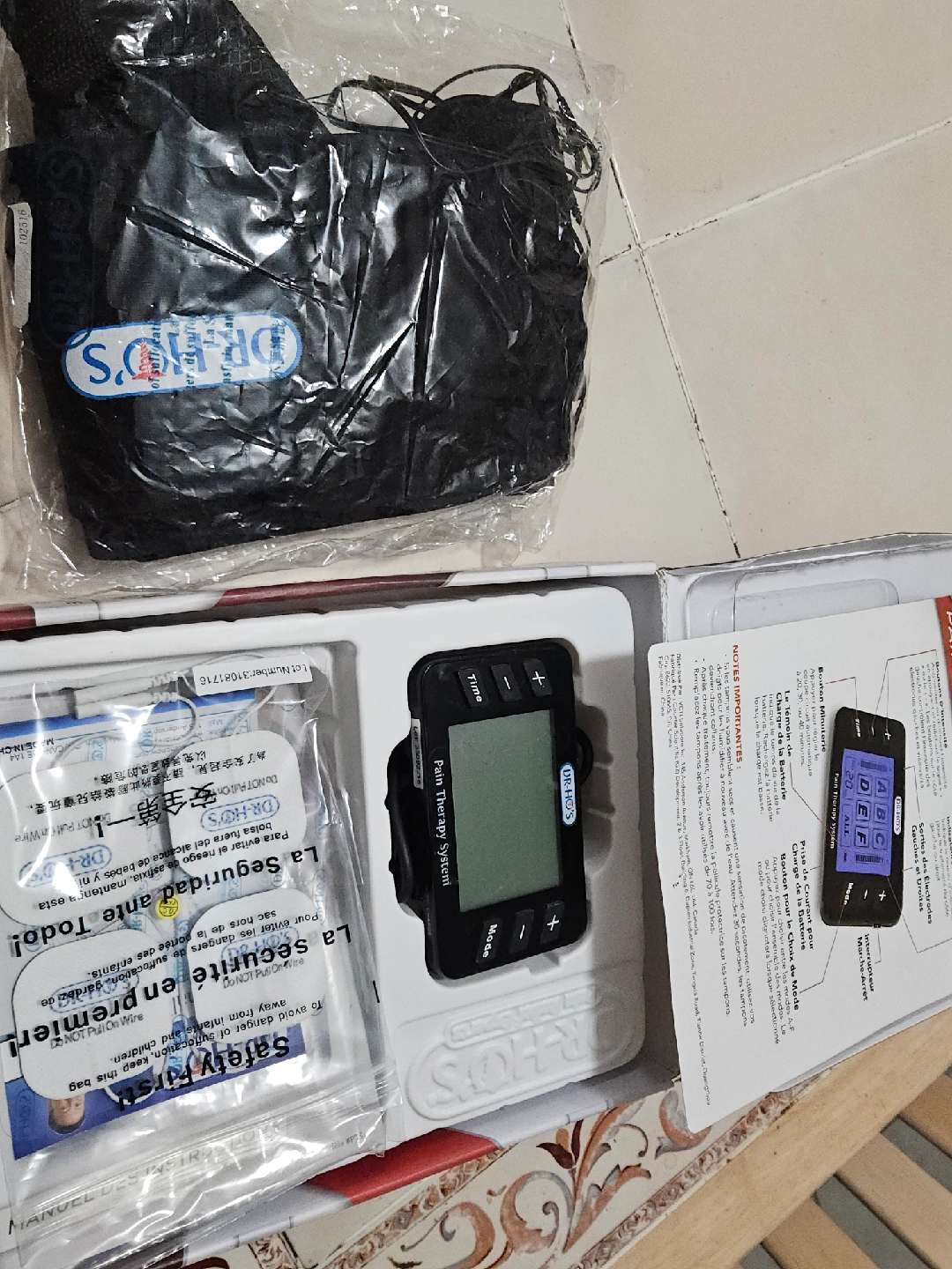 Selling a Dr-Ho's Pain Therapy System. It's designed to help with back, neck, and knee pain. The system includes a device with a screen and several buttons, plus accessories. It's made of neoprene and nylon jersey material.