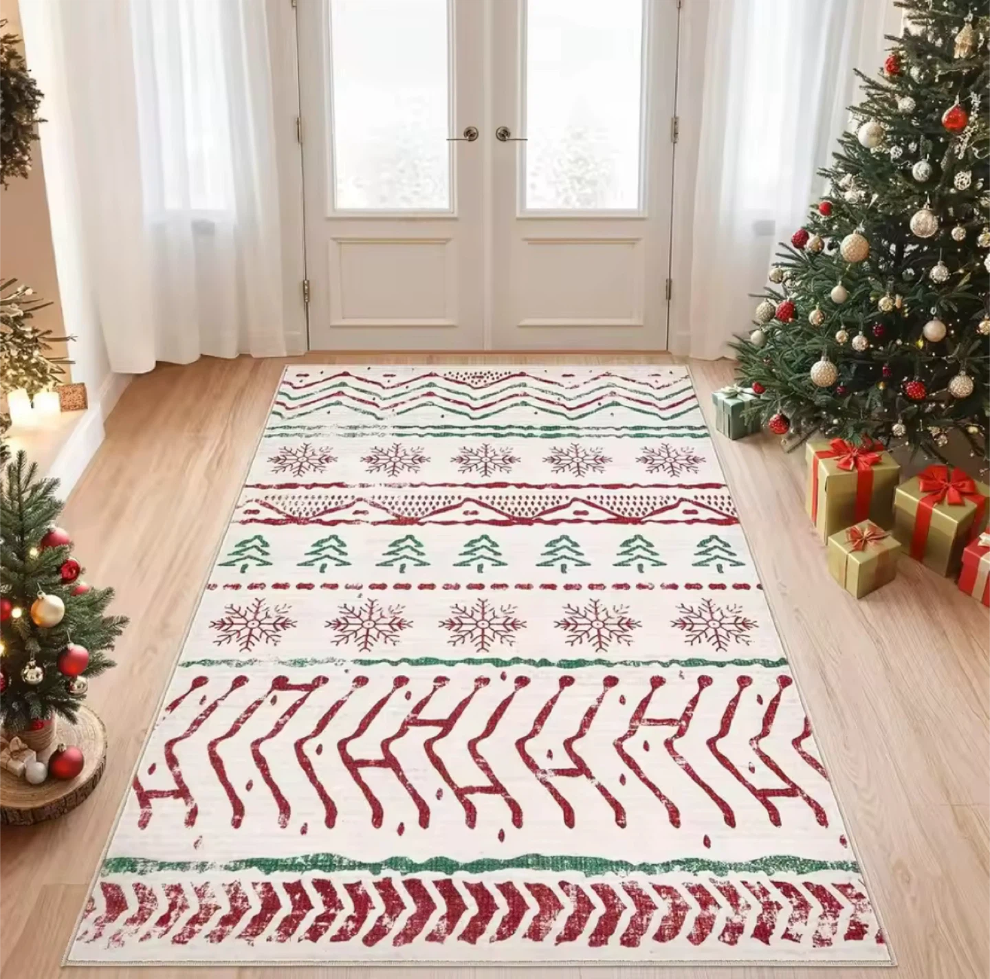 This is a Christmas-themed area rug. It features a festive pattern with red, green, and white colors. It's machine washable and can be vacuumed or ironed at a low temperature. Perfect for adding a holiday touch to your home!