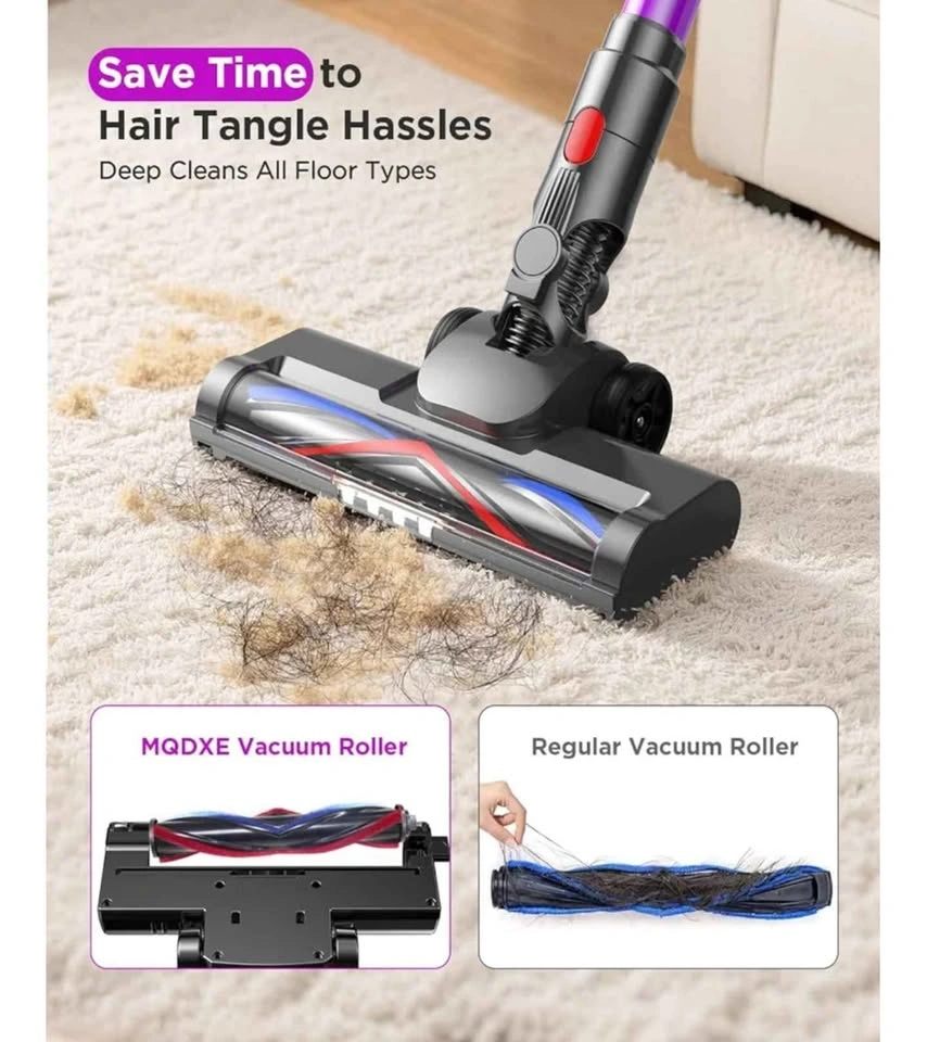 【 Anti-Tangle Brush – No More Stuck Pet Hair】Self-cleaning brush roll for hassle-free pet hair removal.The upgraded anti-tangle brush prevents 99% of hair wrap,making it perfect for homes with shedding pets.This cordless stick vac is perfect for pet owners.