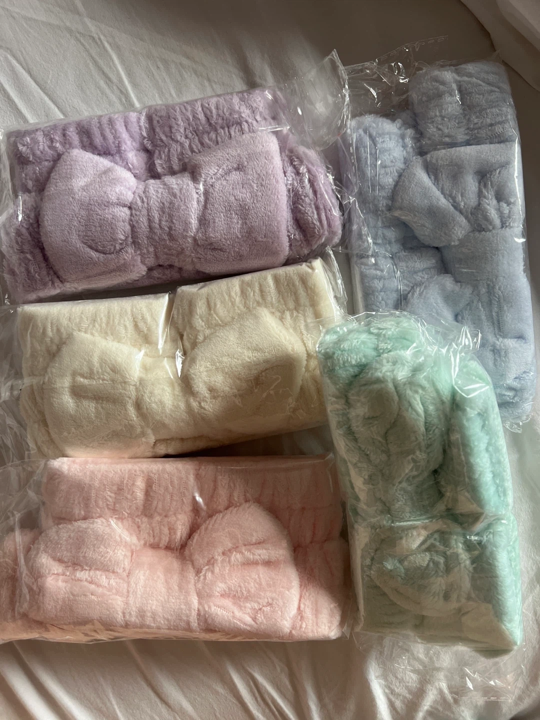 I'm selling these super cute, brand new fuzzy headbands! They're perfect for keeping your hair out of your face while you're doing your skincare routine or applying makeup. They come in a variety of soft pastel colours: lavender, light blue, cream, pink, and mint green. Also perfect for going to a spa or hosting a sleepover :) They're soft and comfy!