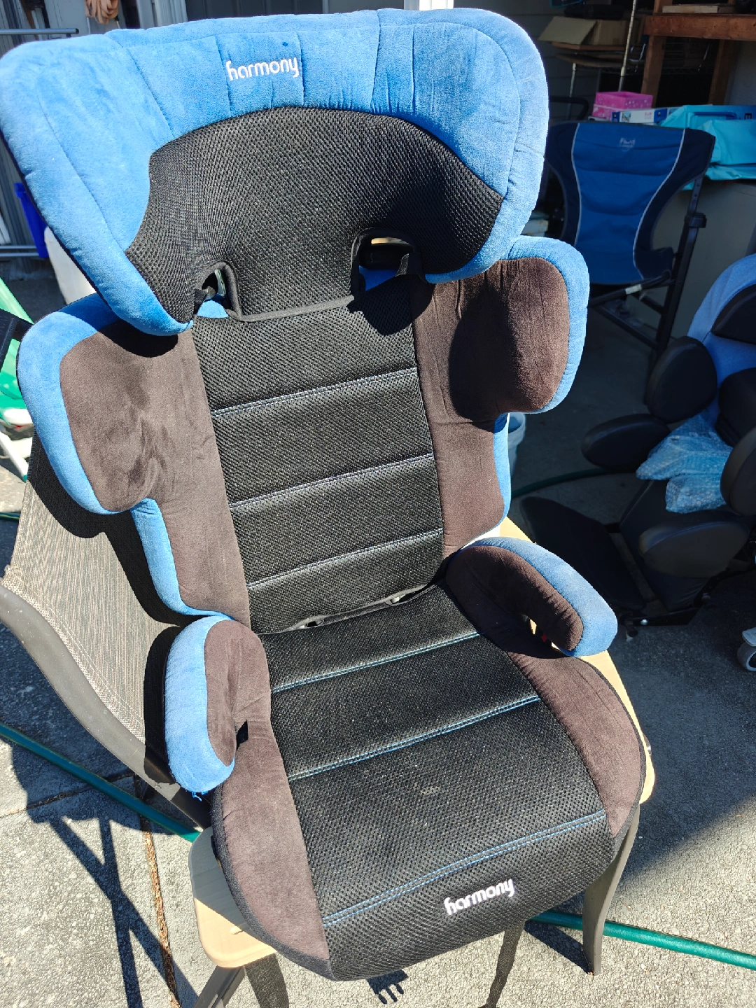 Selling a Harmony booster car seat in blue and black. It's in good condition and ready for a new home! Perfect for keeping your little one safe and comfy on the road.