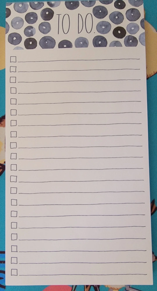 Selling a cute 'To Do' list notepad. It has a stylish design with blue and grey circles at the top, perfect for keeping your tasks organized. The notepad is lined and has checkboxes for each item, making it easy to track your progress.