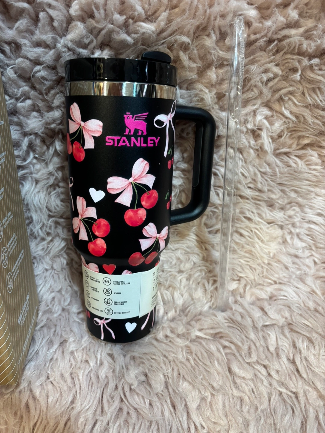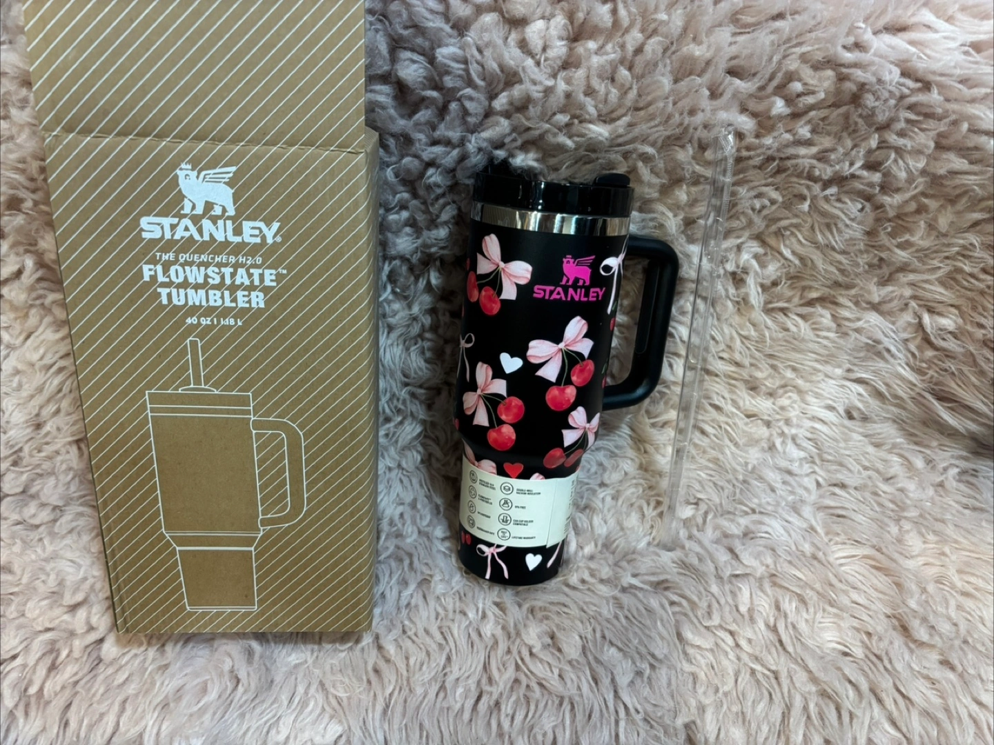 Stanley The Quencher H2.0 Flowstate Tumbler in the 40 oz size! It's black with a cute cherry design. This tumbler features double wall vacuum insulation and includes a straw. The box is included!
