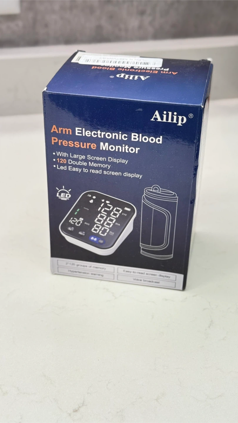 brand new Ailip Arm Electronic Blood Pressure Monitor! It comes with a large screen display and 120 double memory. The LED screen is easy to read. The cuff size is 22-32cm (8.66-12.6 inch). It also comes with the box