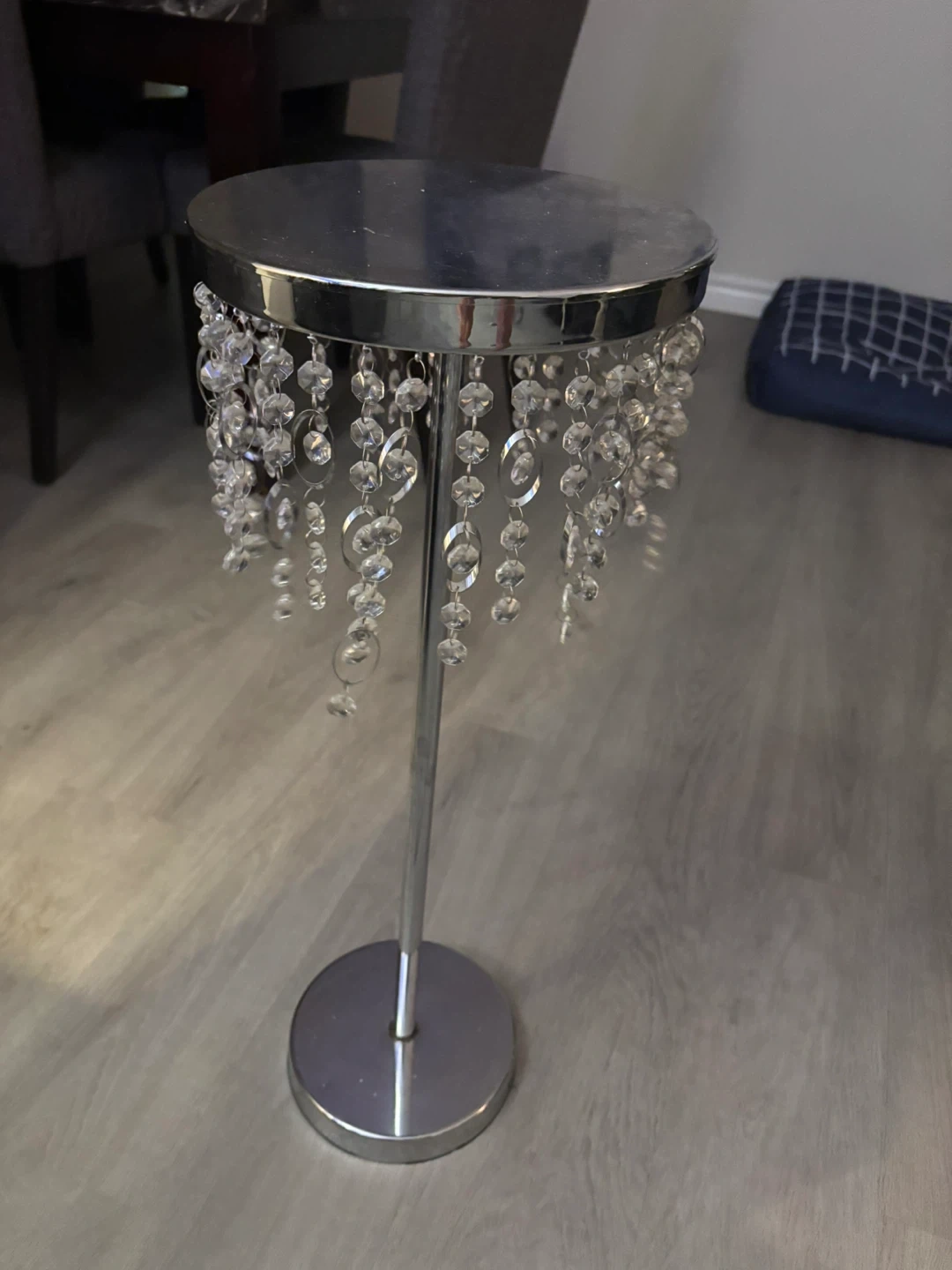 Selling a stylish silver accent table that would look great in any room! It features a sleek silver finish and is adorned with beautiful crystal beads that catch the light. Perfect for displaying plants, lamps, or other decorative items. It's in great condition and ready for a new home!