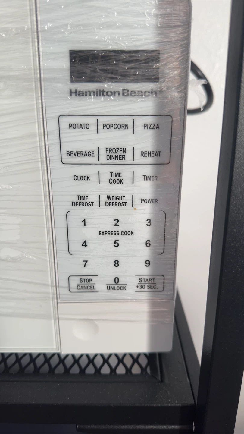 Selling a Hamilton Beach microwave oven. It's in great condition and ready to heat up your favourite meals! Features include settings for potato, popcorn, pizza, beverage, frozen dinner, and reheat. It also has time defrost and weight defrost settings, plus a convenient +30 sec button