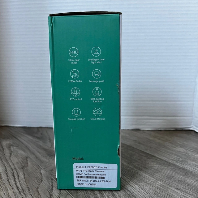 This is a new Tapo WiFi PTZ Bulb Camera, offering 3MP resolution and AI human detection for enhanced security. It's designed to easily screw into any standard light socket for convenient placement and discreet monitoring. Key features include:
