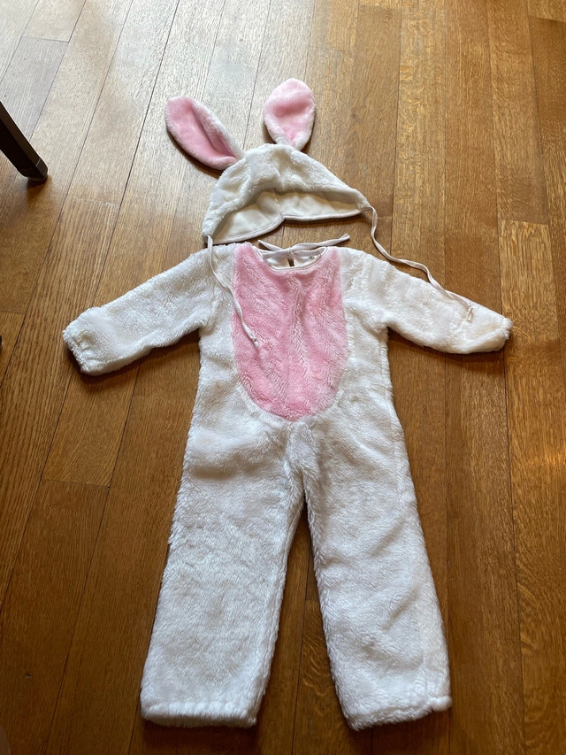 This adorable, used bunny costume, size 2-4 years, is perfect for dress-up, Easter or Halloween! The white, plush fabric is soft and cozy, featuring a pink belly patch and a hooded headpiece with bunny ears. It's in good condition and ready for hopping adventures! * Soft, plush material * Attached hood with bunny ears * Pink belly detail Looking to pass this on to some bunny who will love it. If the ad is up, it's still available!