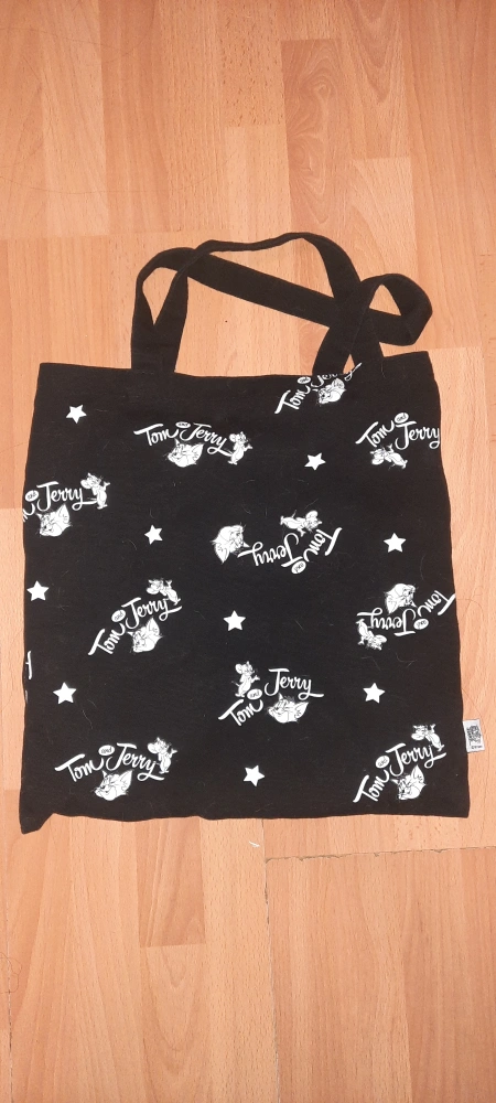 Cute Tom & Jerry themed tote bag! It's black with white prints of Tom and Jerry characters and stars. Perfect for carrying your everyday essentials in a fun and stylish way