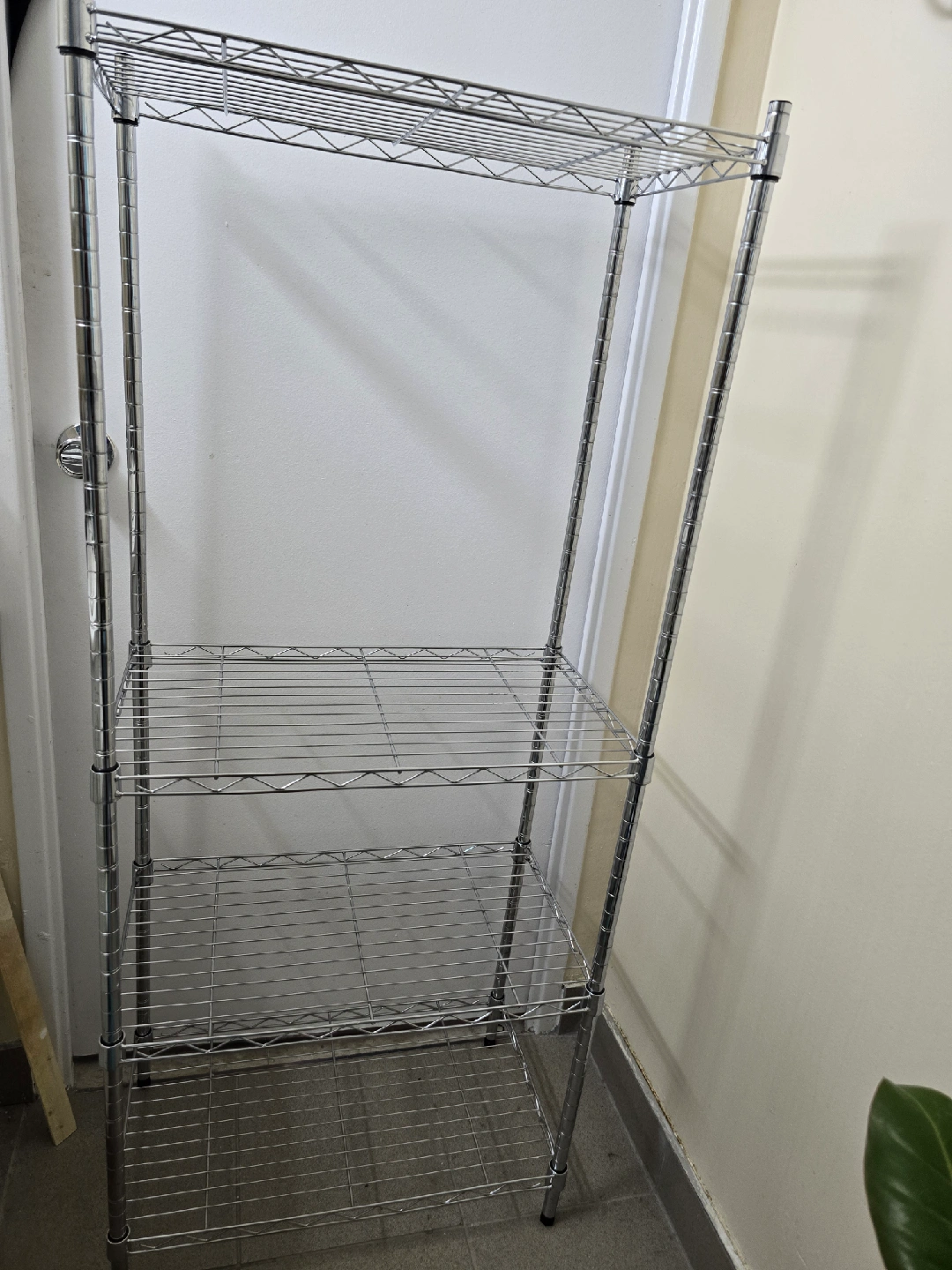Selling a chrome metal wire shelving unit. Great for organizing items in your home or garage. It's in good condition and ready for a new home!
