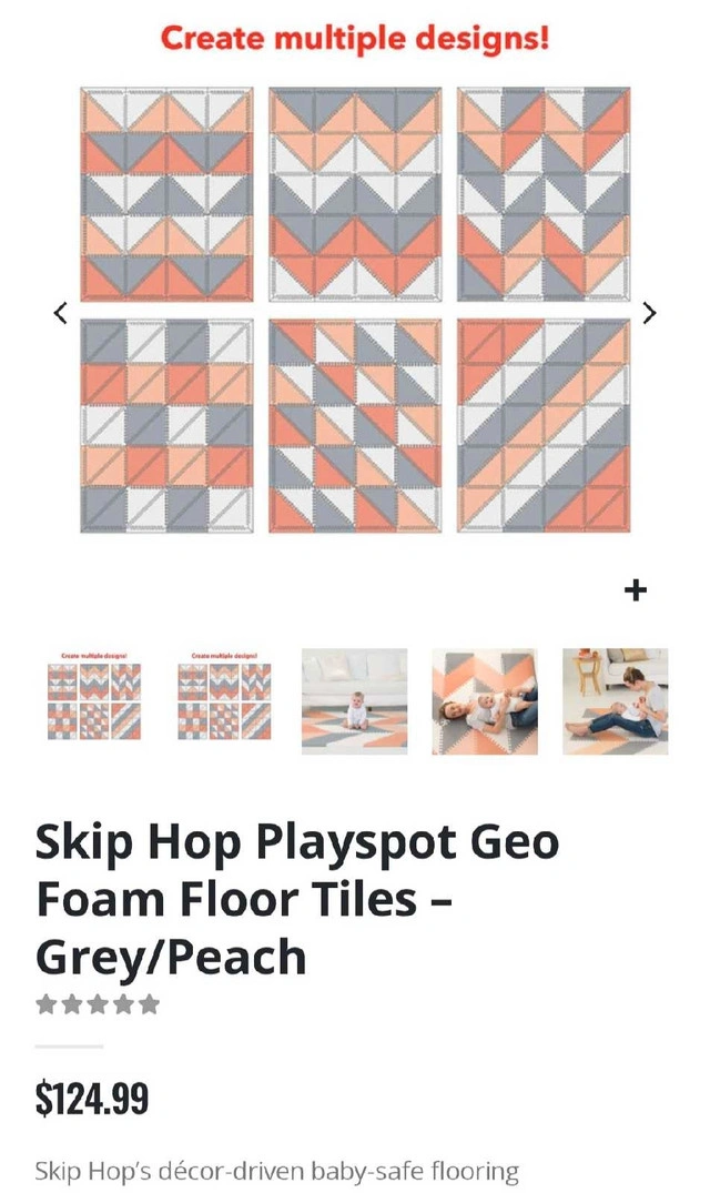 Enhance your child's play area with this Skip Hop Playspot Geo Foam Floor Tiles in Grey/Peach, designed to complement your home’s décor while keeping your child comfortable and happy. With a triangle shape, our foam floor tiles easily connect like a puzzle for the ultimate customization of your little one’s play space.