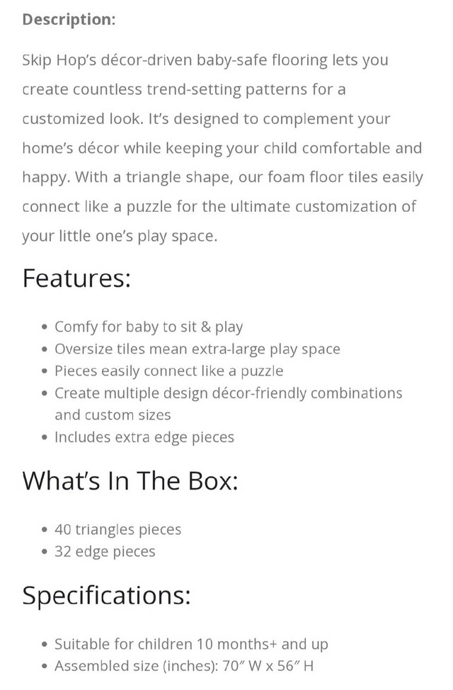 - Comfy for baby to sit & play - Oversize tiles mean extra-large play space - Pieces easily connect like a puzzle - Create multiple design décor-friendly combinations and custom sizes - Includes extra edge pieces What's In The Box: - 40 triangles pieces - 32 edge pieces(a couple of pieces are scratched on the bottom side and does not effect its look or function)