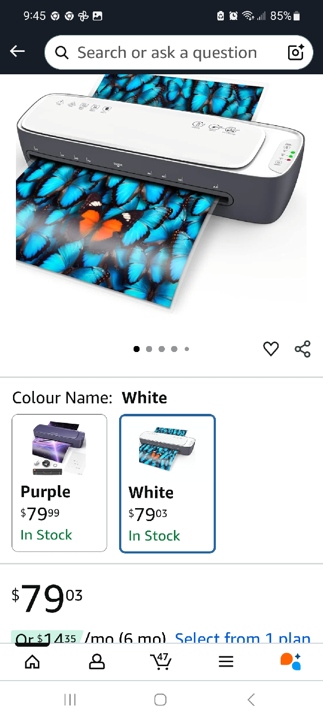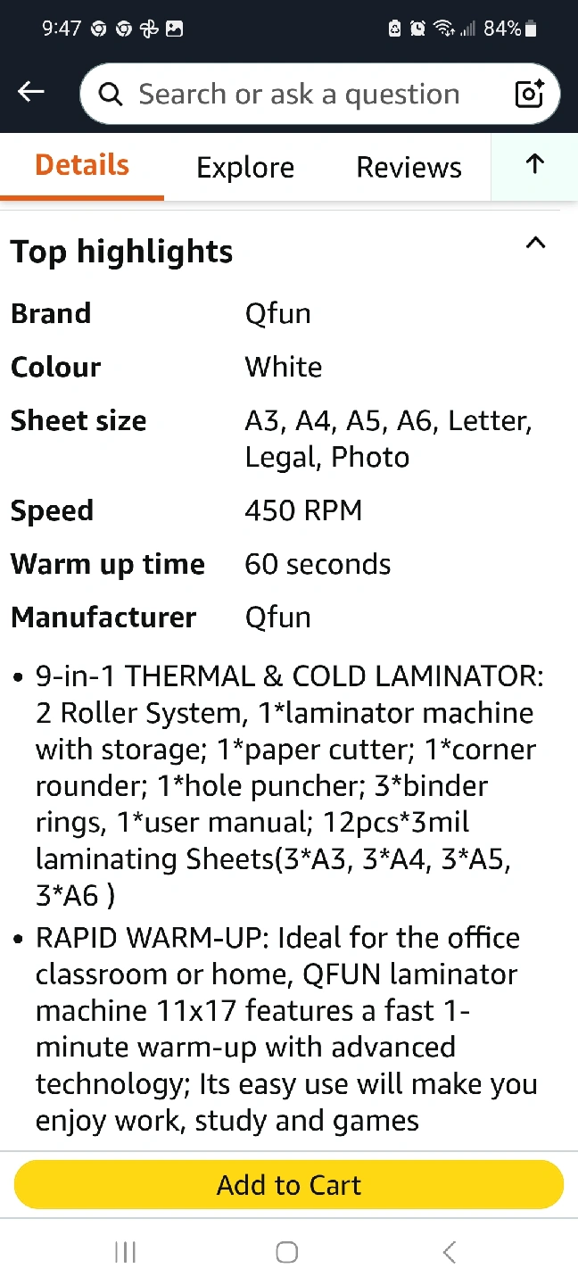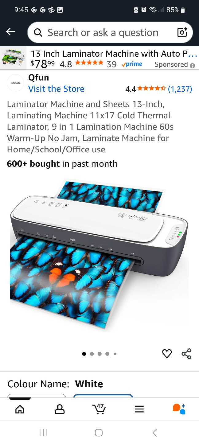I'm selling a Qfun 13-inch laminator machine in white. It's a 9-in-1 thermal and cold laminator with a 2 roller system. This laminating machine is suitable for home, school, or office use. It warms up in 60 seconds and has a speed of 450 RPM. It supports sheet sizes A3, A4, A5, A6, Letter, and Photo. It also comes with a paper cutter, corner rounder, hole puncher, binder rings, and laminating sheets (3*A3, 3*A4, 3*A5, 3*A6).