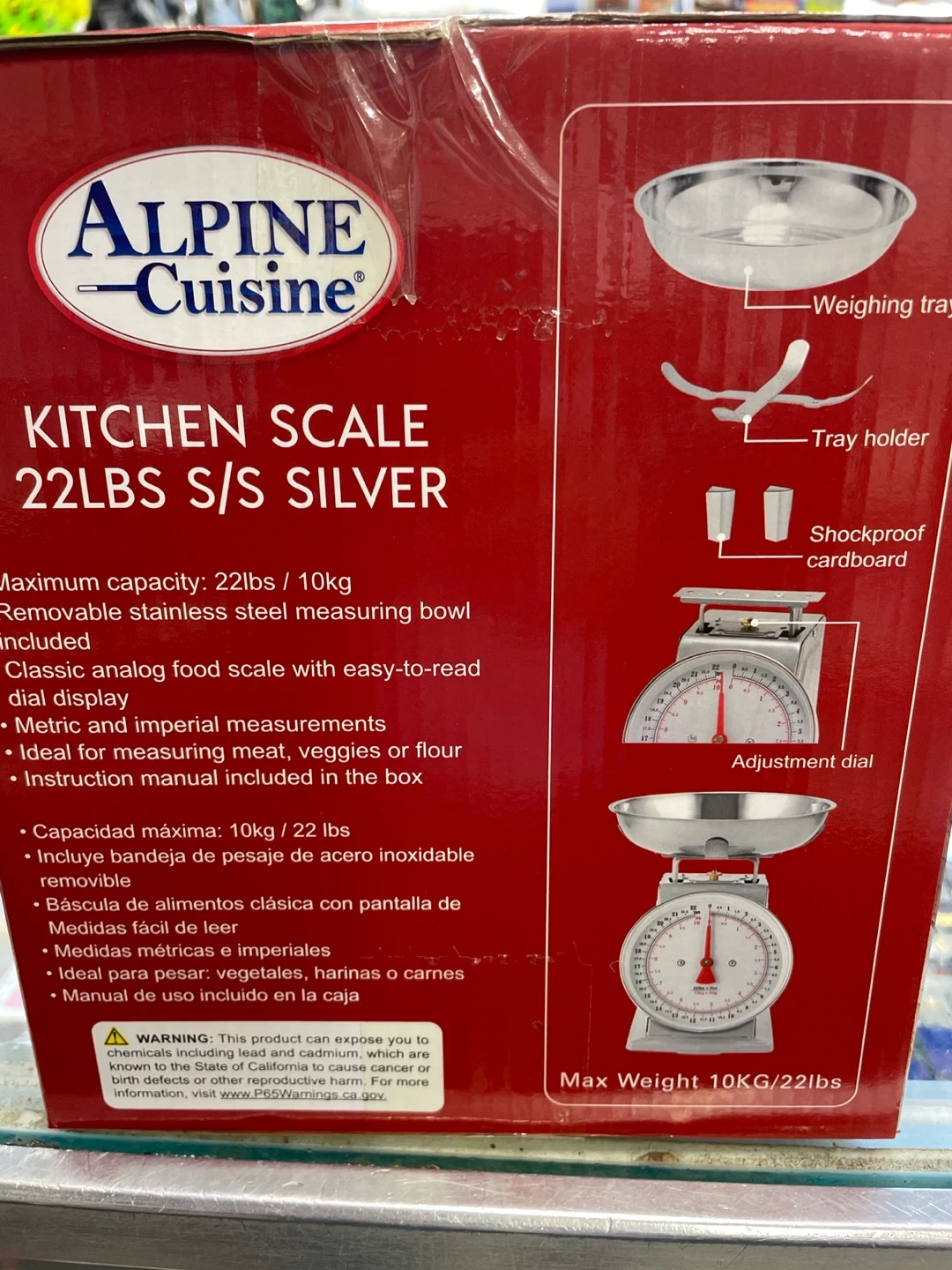 Selling a brand new Alpine Cuisine Kitchen Scale! This is the 22lbs S/S Silver model. It features a removable stainless steel measuring bowl and a classic analog food scale with an easy-to-read dial display. It's perfect for measuring meat, veggies, or flour. The box includes the weighing tray, tray holder, shockproof cardboard, and adjustment dial