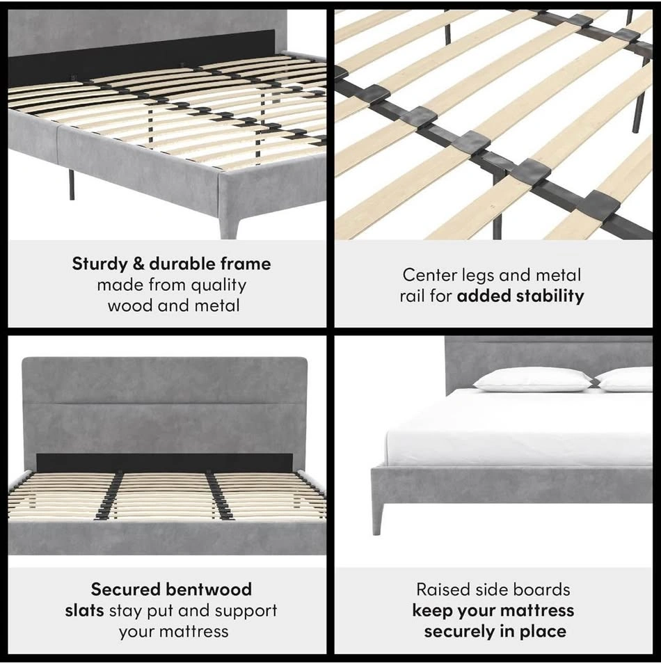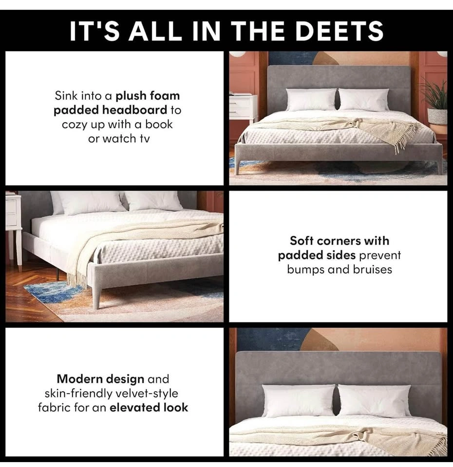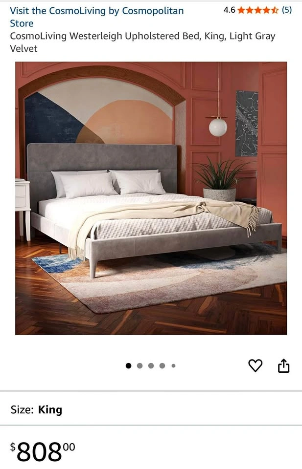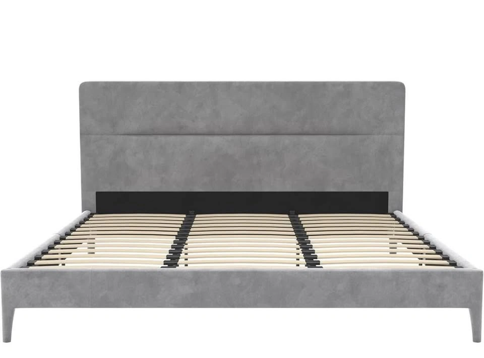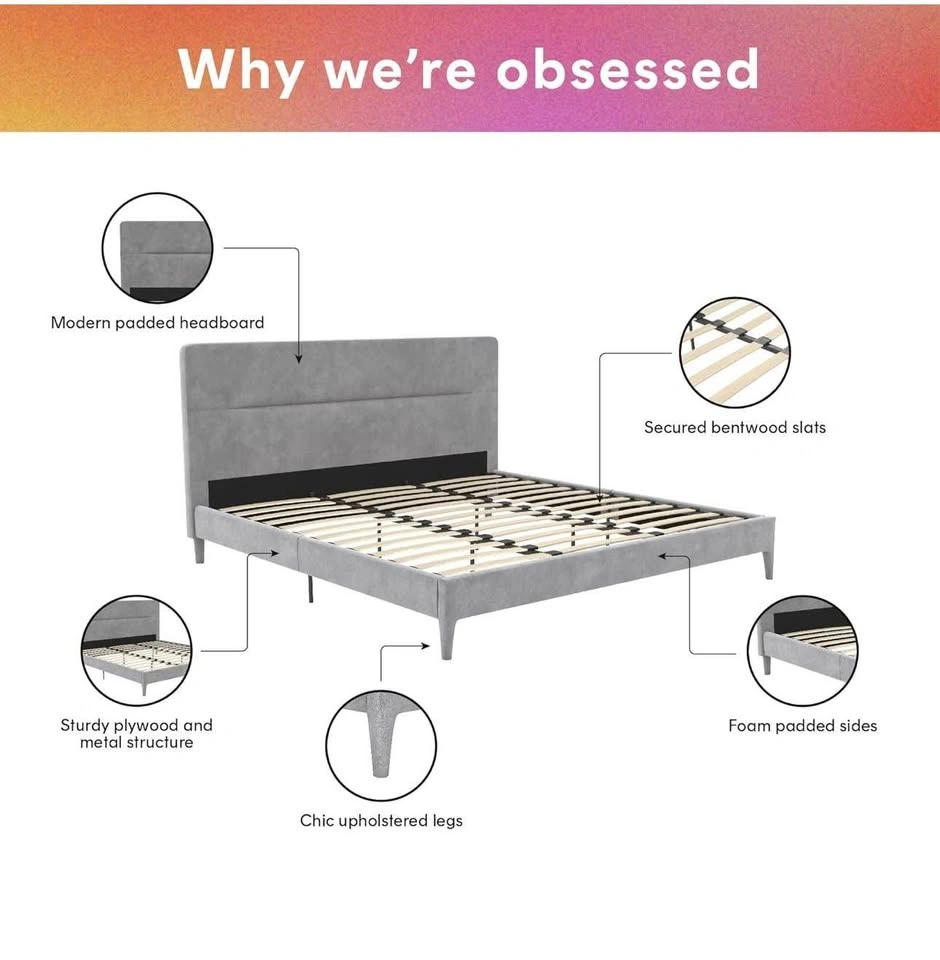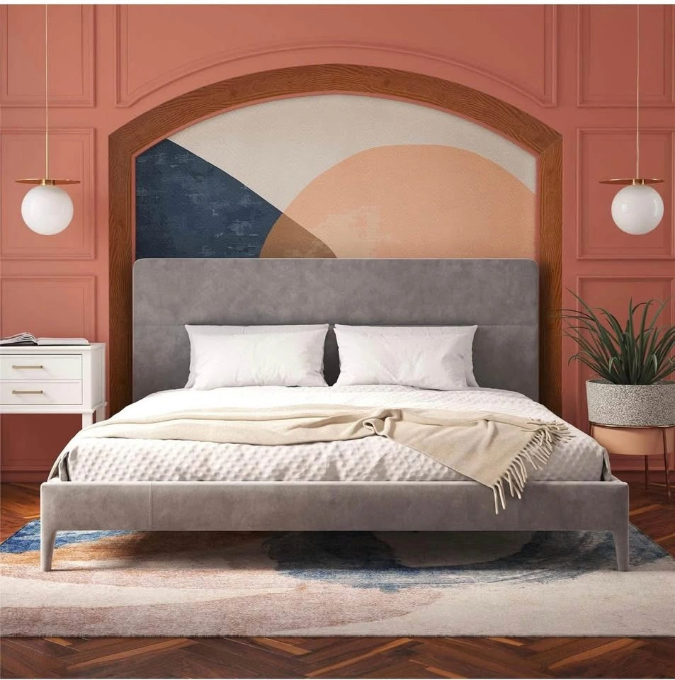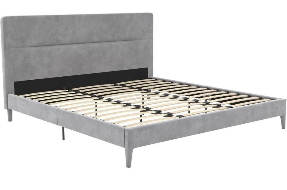 New and sealed CosmoLiving Westerleigh Upholstered Bed in light gray velvet, Queen size.