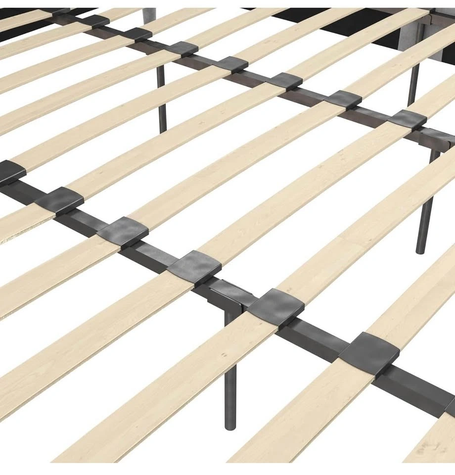 Platform bed with a minimalist tufted headboard and narrow legs. The wood frame is sturdy, and the bentwood slat system means no box spring is needed. Metal side rails and center legs add reinforcement. Mattress not included.
