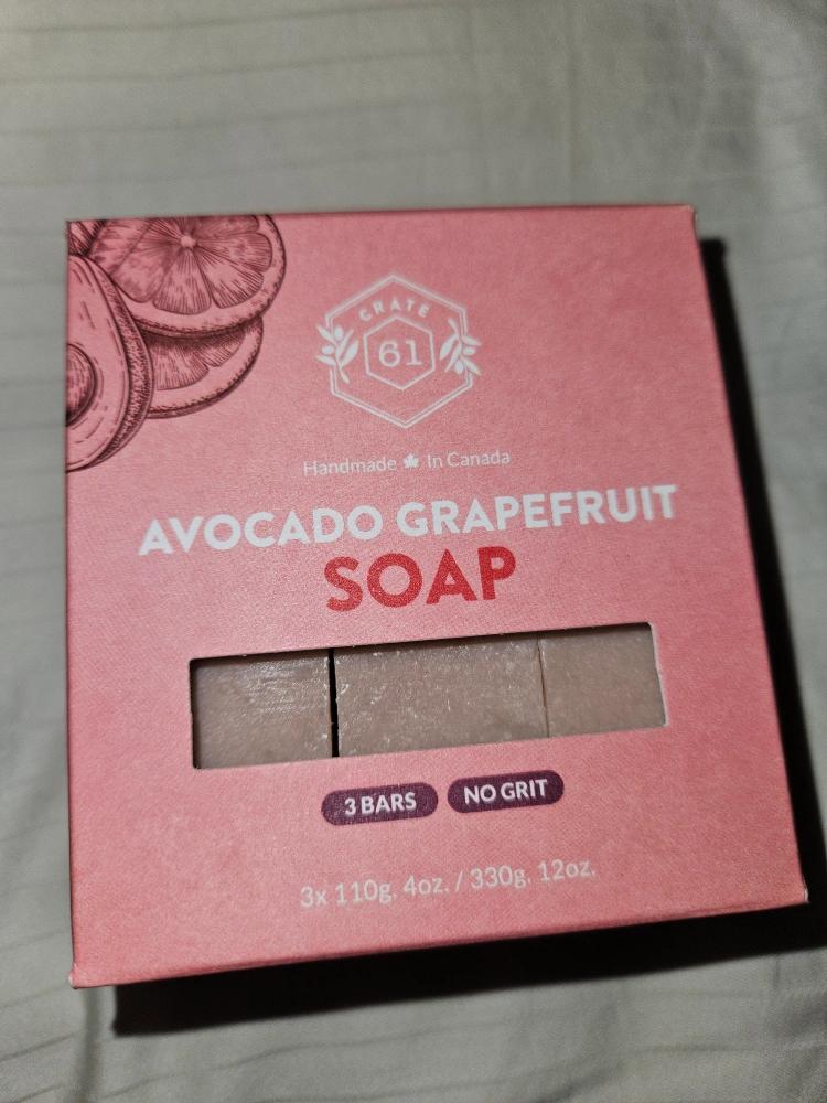 Selling a brand new box of Crate 61 Organic Avocado Grapefruit Soap! The box contains 3 bars of soap. Each bar is 110g / 4oz, for a total of 330g / 12oz.