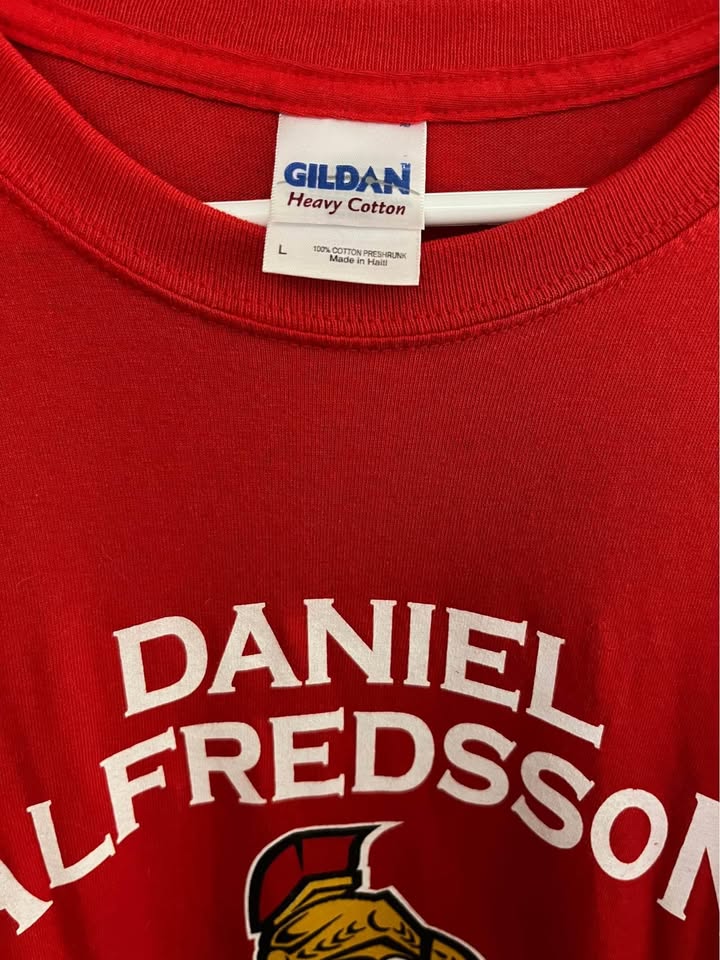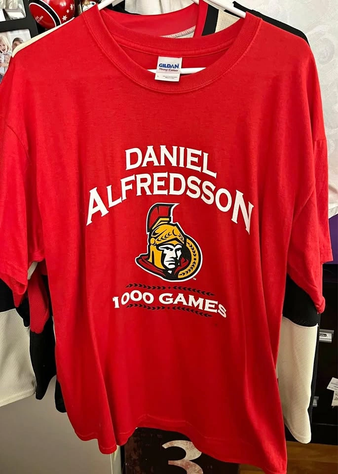 Alfredsson 1000-Games Pre-Game Celebration T-Shirt Memorabilia handed out at the April 10, 2010 home game against the Boston Bruins. Large, New, Never Worn, $20.00. Pick up 10-min drive East of downtown Ottawa. If the ad is up, it is available.
