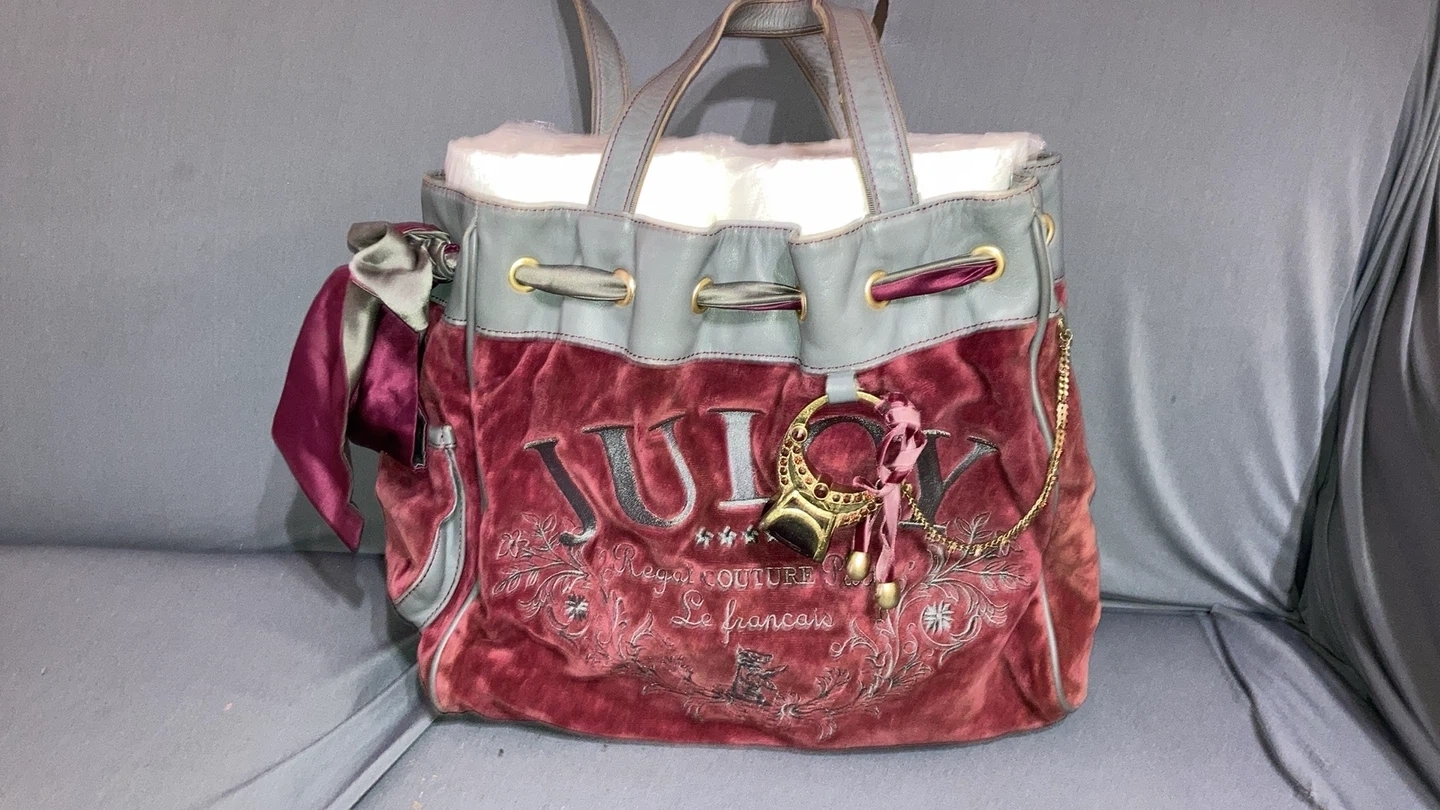 Selling a Juicy Couture Signature Y2K bucket bag! This velour bag features jewels, a heart mirror, and a scarf. $200 firm. It's in great condition and ready for a new home. Pickup near Islington and Steeles