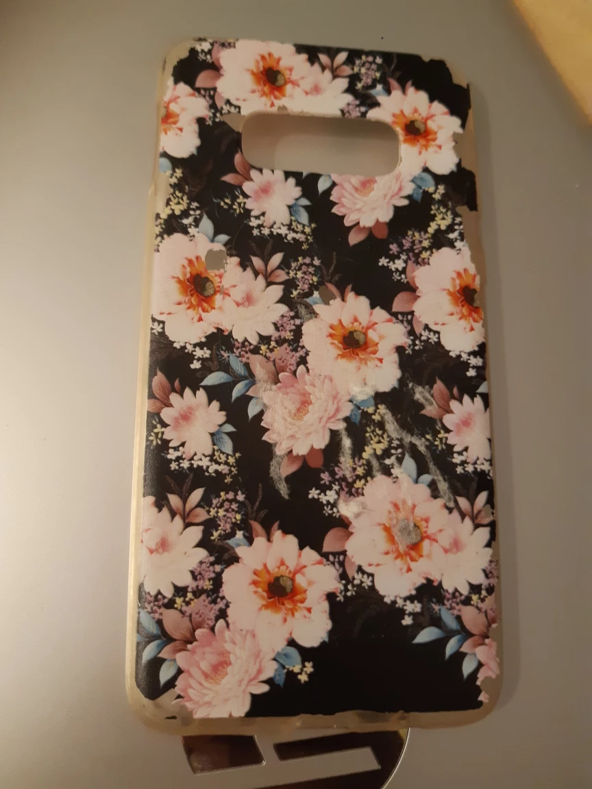 Selling a used Samsung Galaxy S10e phone case. It has a floral design on a black background. There are some signs of wear and tear around the edges, but it still works perfectly fine to protect your phone