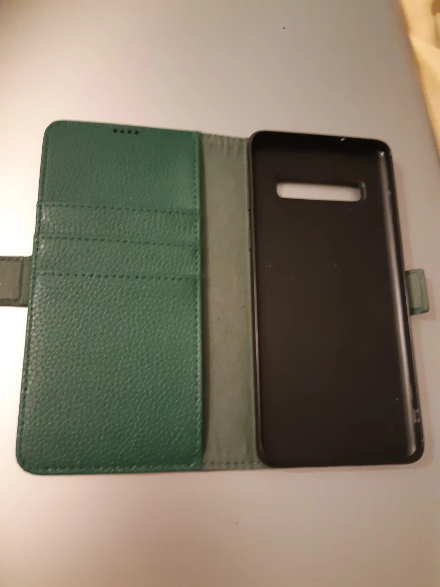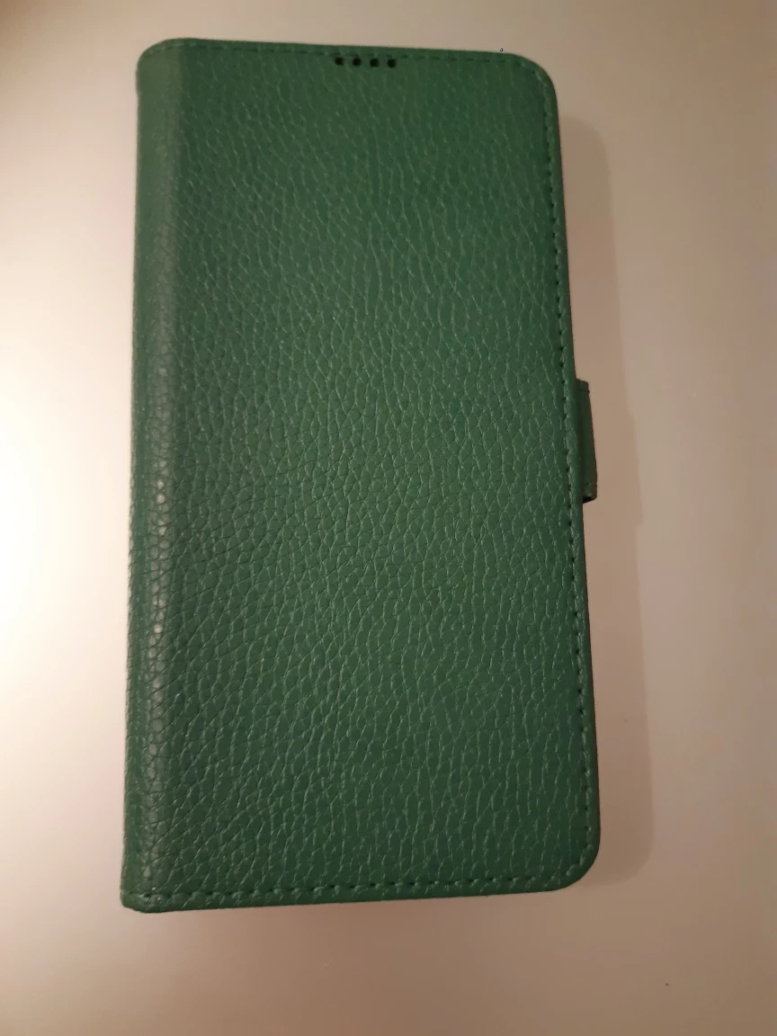 Selling a green leather phone case for a Samsung Galaxy S10. It's in great condition and offers good protection for your phone! The case has a nice leather texture and a secure closure.