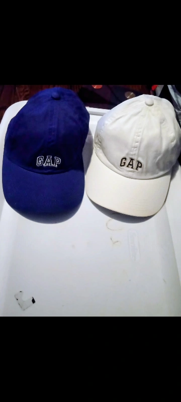 Selling two GAP hats, one in blue and one in white. Both are in good condition and ready for a new home! They're perfect for everyday wear.