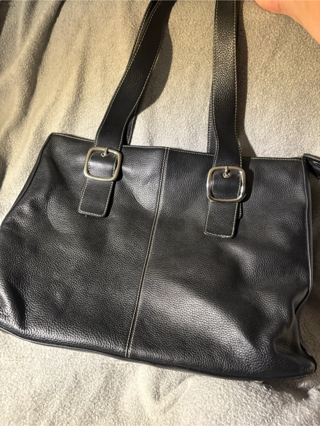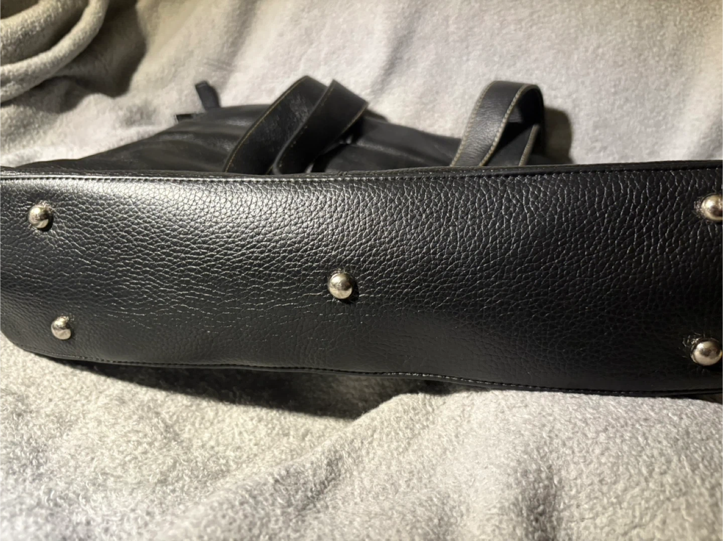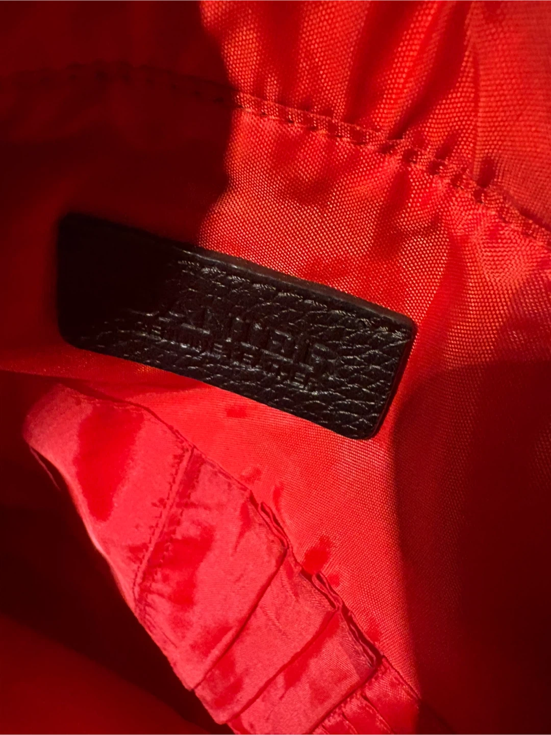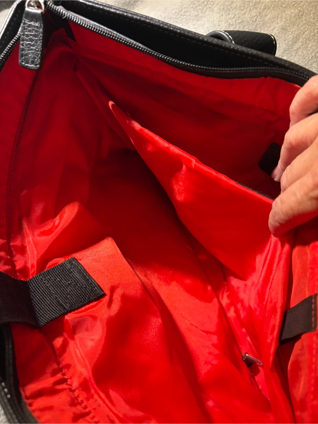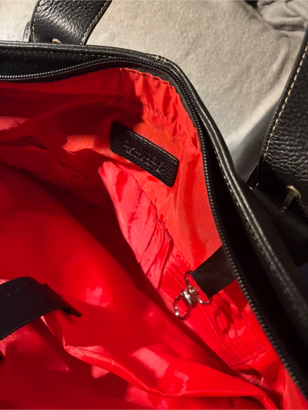 Classic black leather laptop tote bag by Danier. It features a vibrant red interior and silver hardware. Padded section for laptop with velcro to secure. Back pocket that has a zipper at the bottom you can open so the bag can slip over suitcase handle. Rarely used so in like new condition. Pick up Yonge and Eglinton. If listing is up, it’s available.