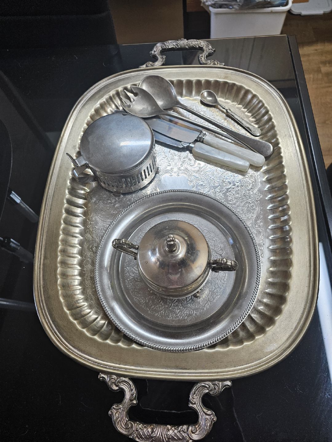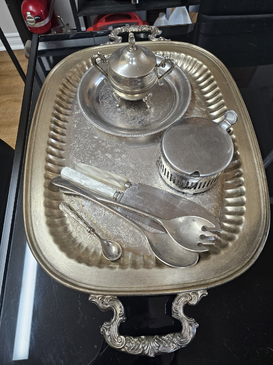 Selling a vintage silver plated serving set. Includes a tray, sugar bowl, and serving utensils. Perfect for adding a touch of elegance to your dining experience!