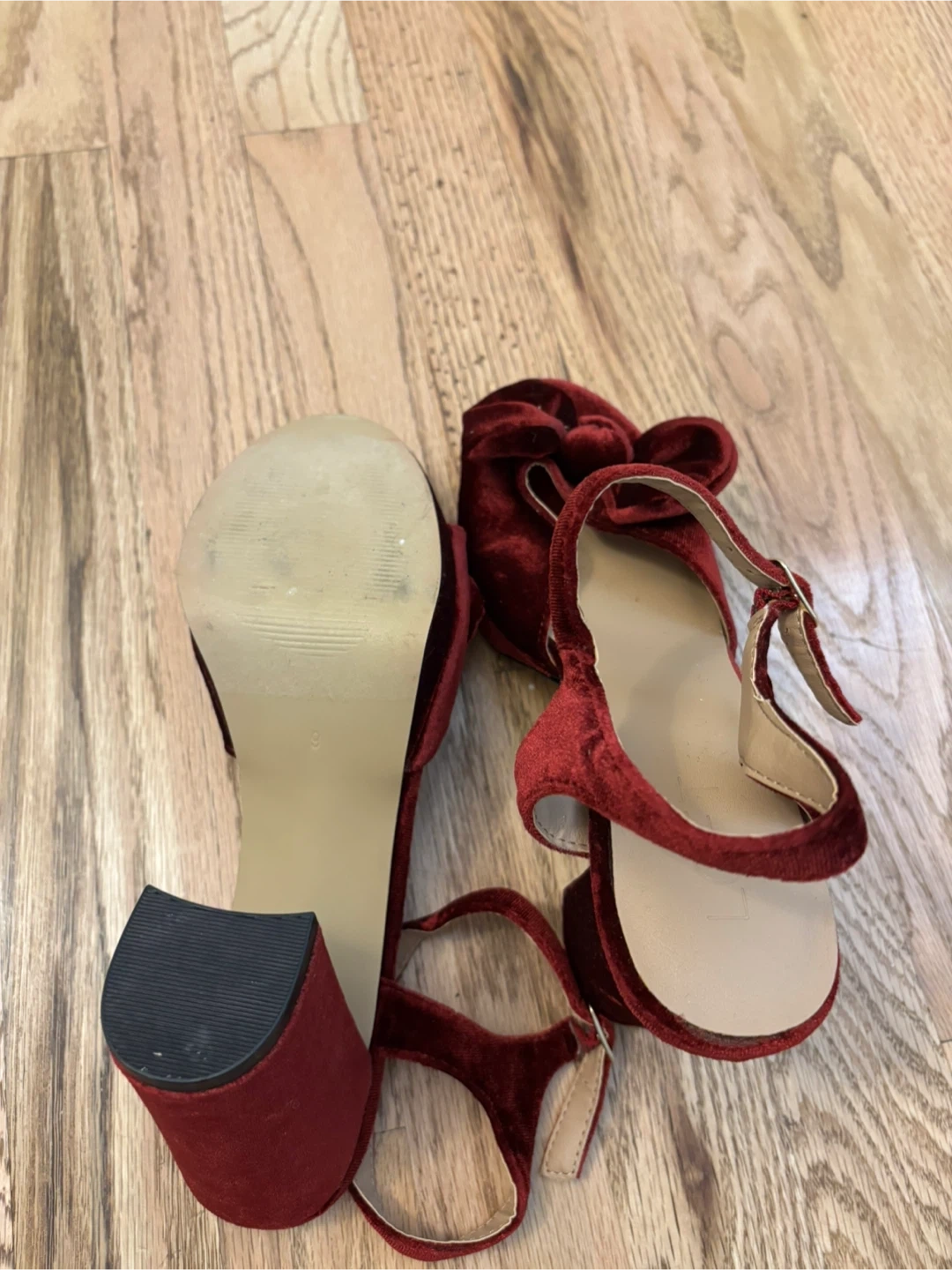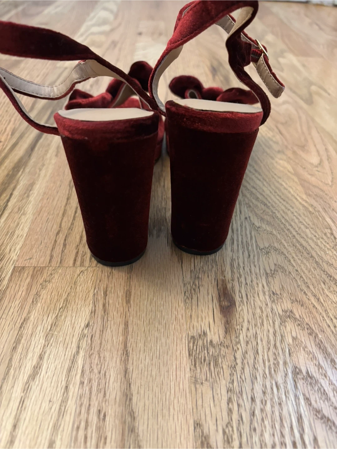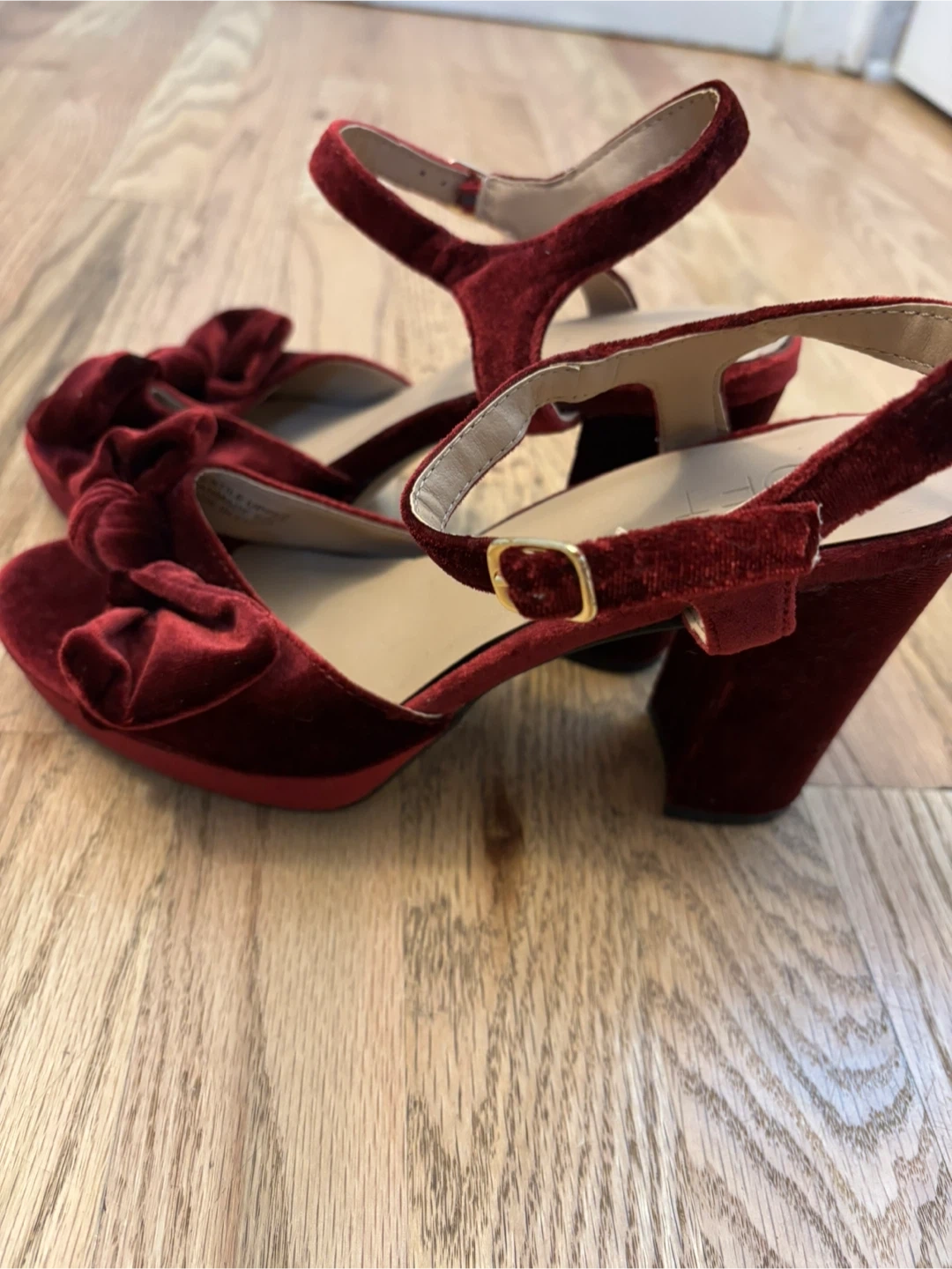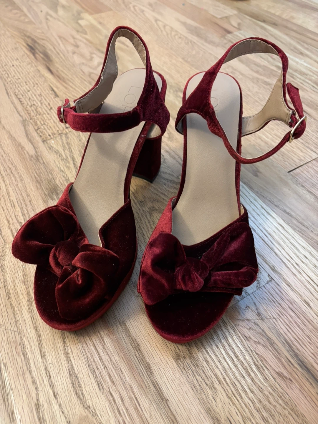 These are a pair of LOFT heels in a beautiful red velvet material. They feature a cute bow detail and an ankle strap. Size 9