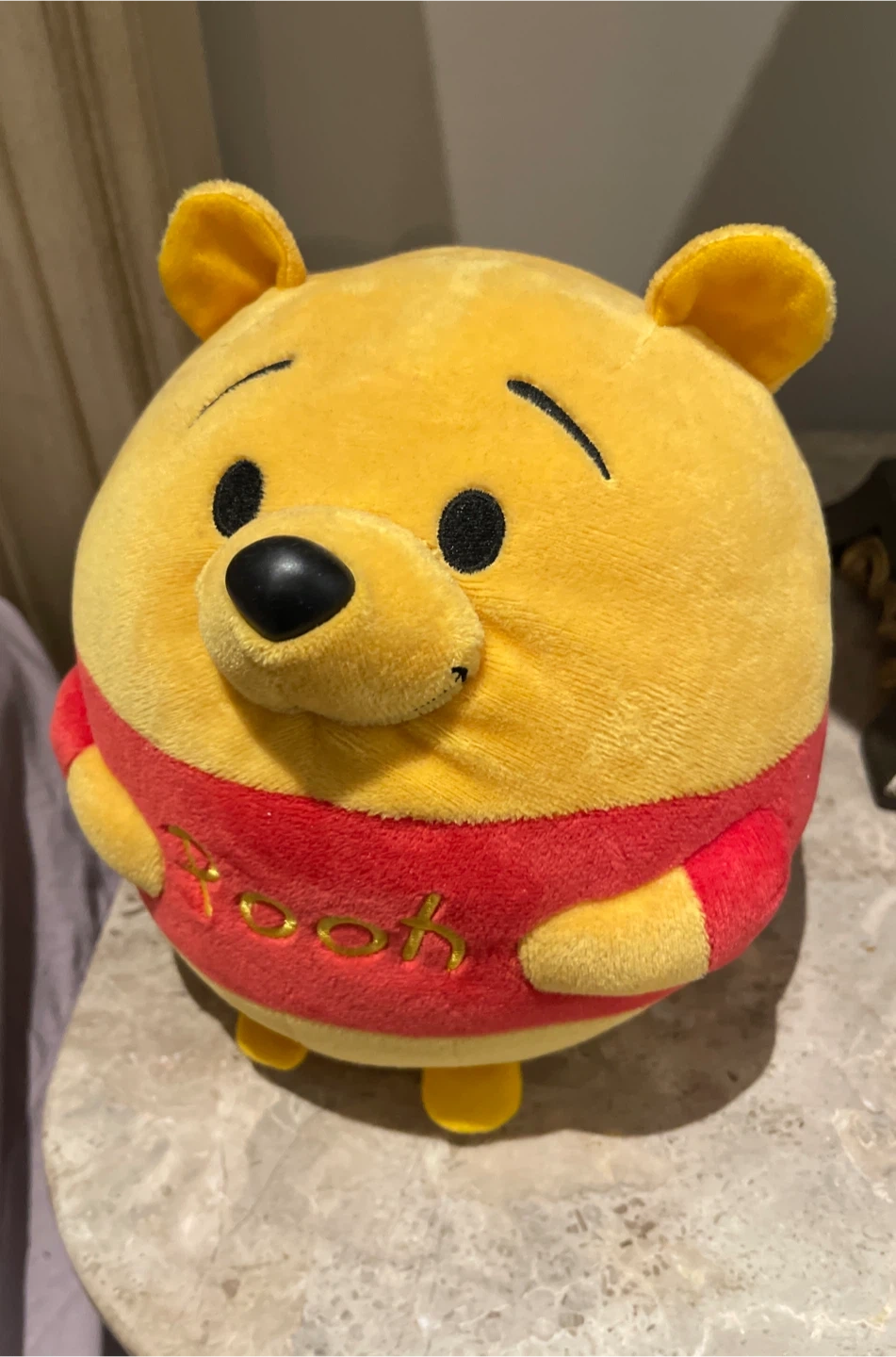 Selling a cute and round Winnie the Pooh plush! It's in great condition and ready for a new home. Perfect for any Disney fan or as a cuddly friend for kids