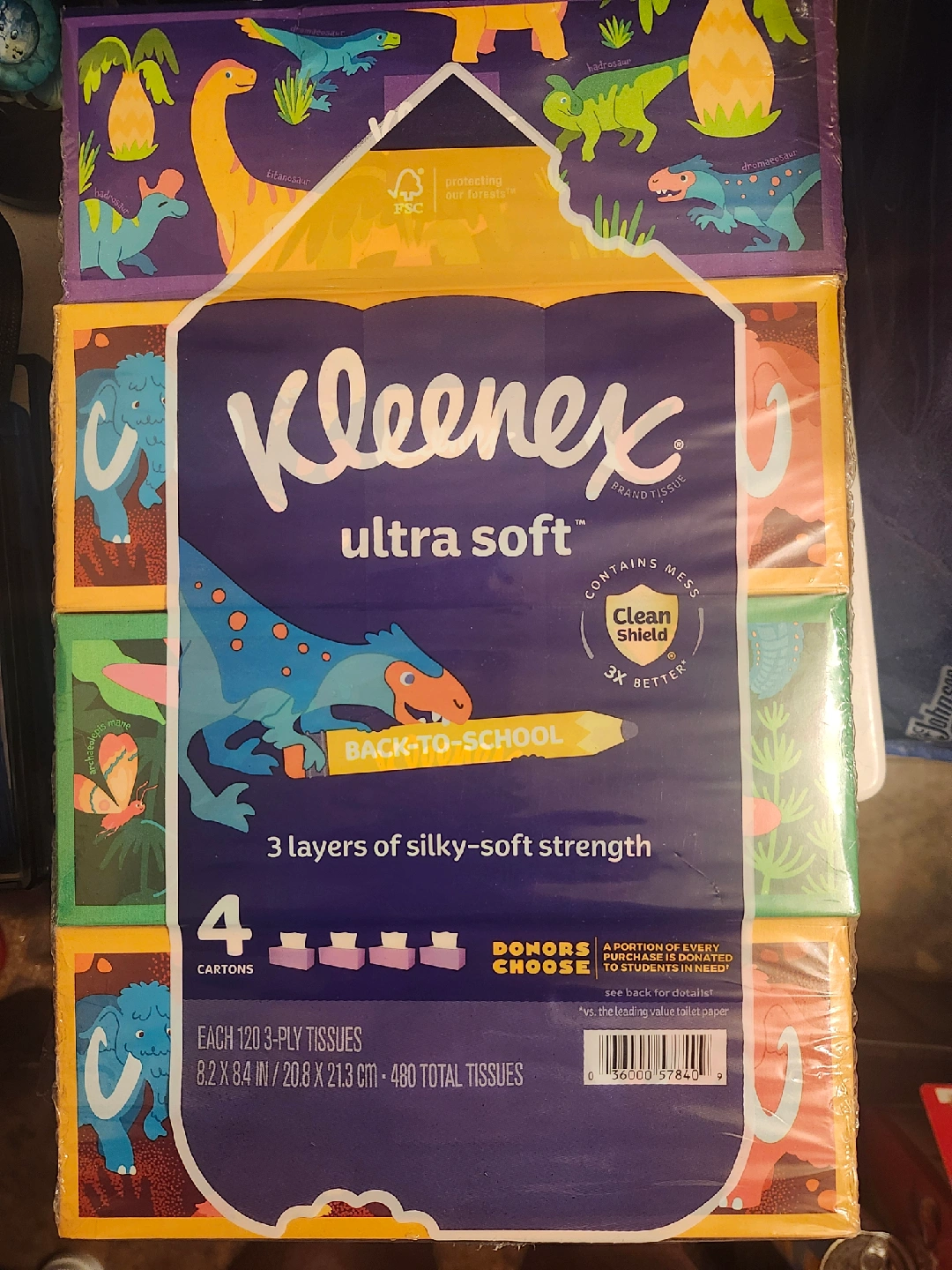 I'm selling a pack of Kleenex Ultra Soft tissues! This includes 4 cartons, with a total of 480 tissues. Each tissue is 3-ply for silky-soft strength. Perfect for back-to-school!