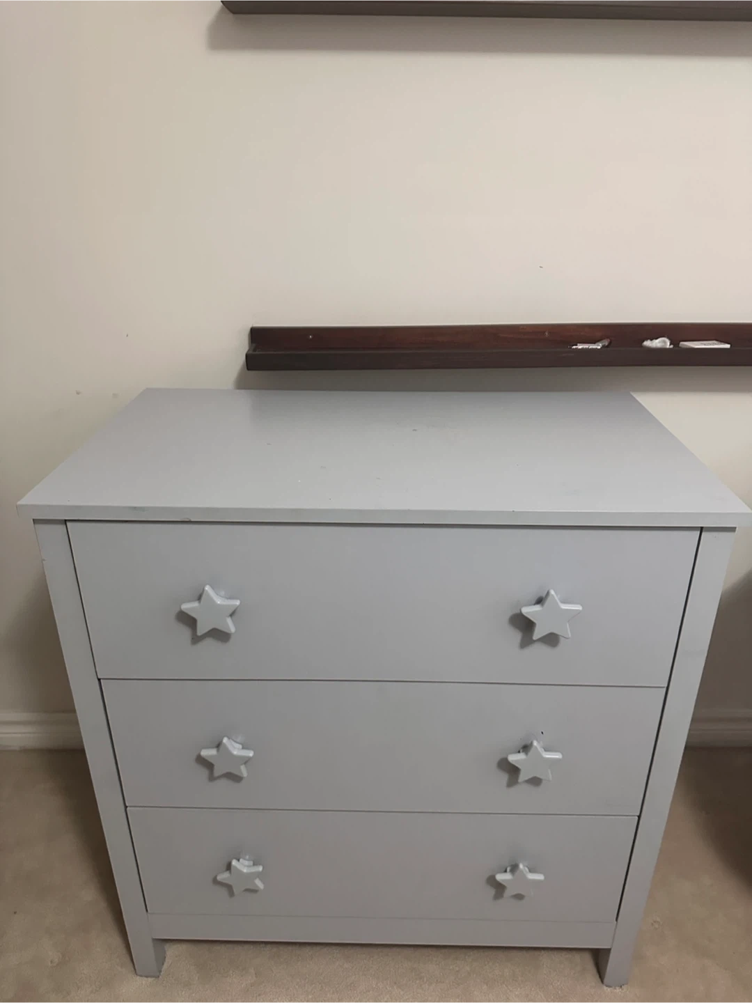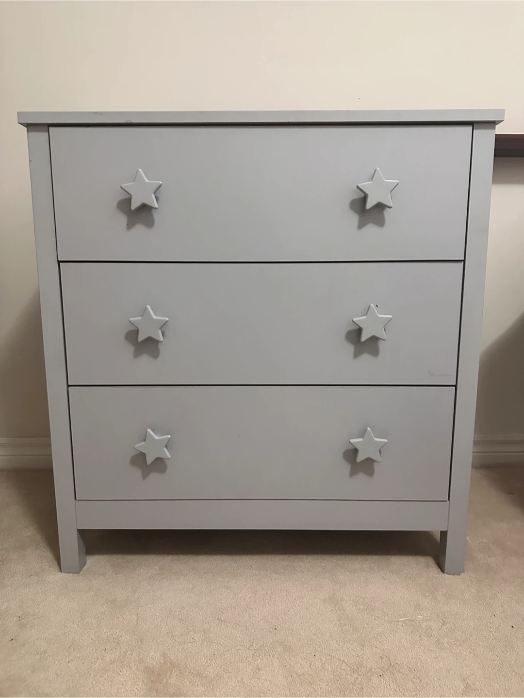 Selling a cute grey 3-drawer dresser! It's in great condition and features star-shaped knobs on each drawer. Perfect for a kid's room or nursery. It's a stylish and functional piece of furniture that will add a touch of charm to any space. We can sell two of the same dresser for 100$ if you want