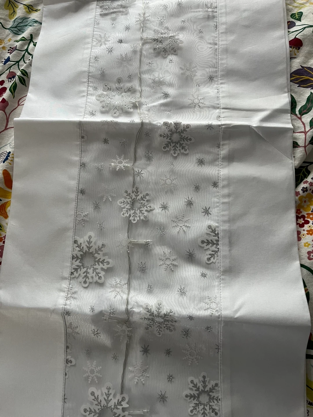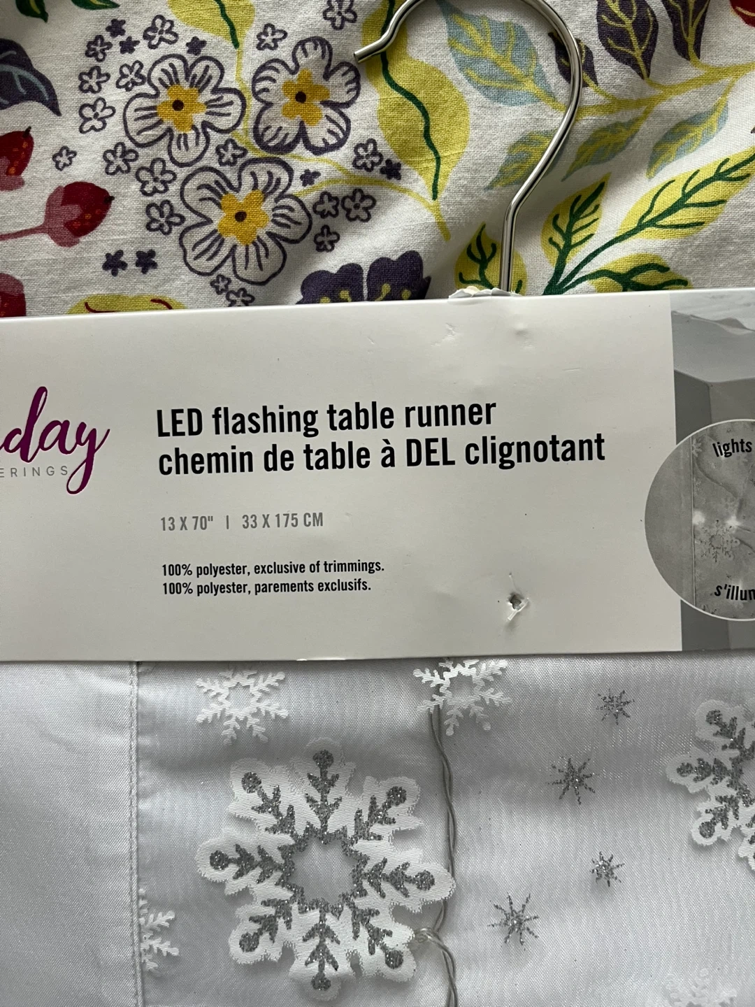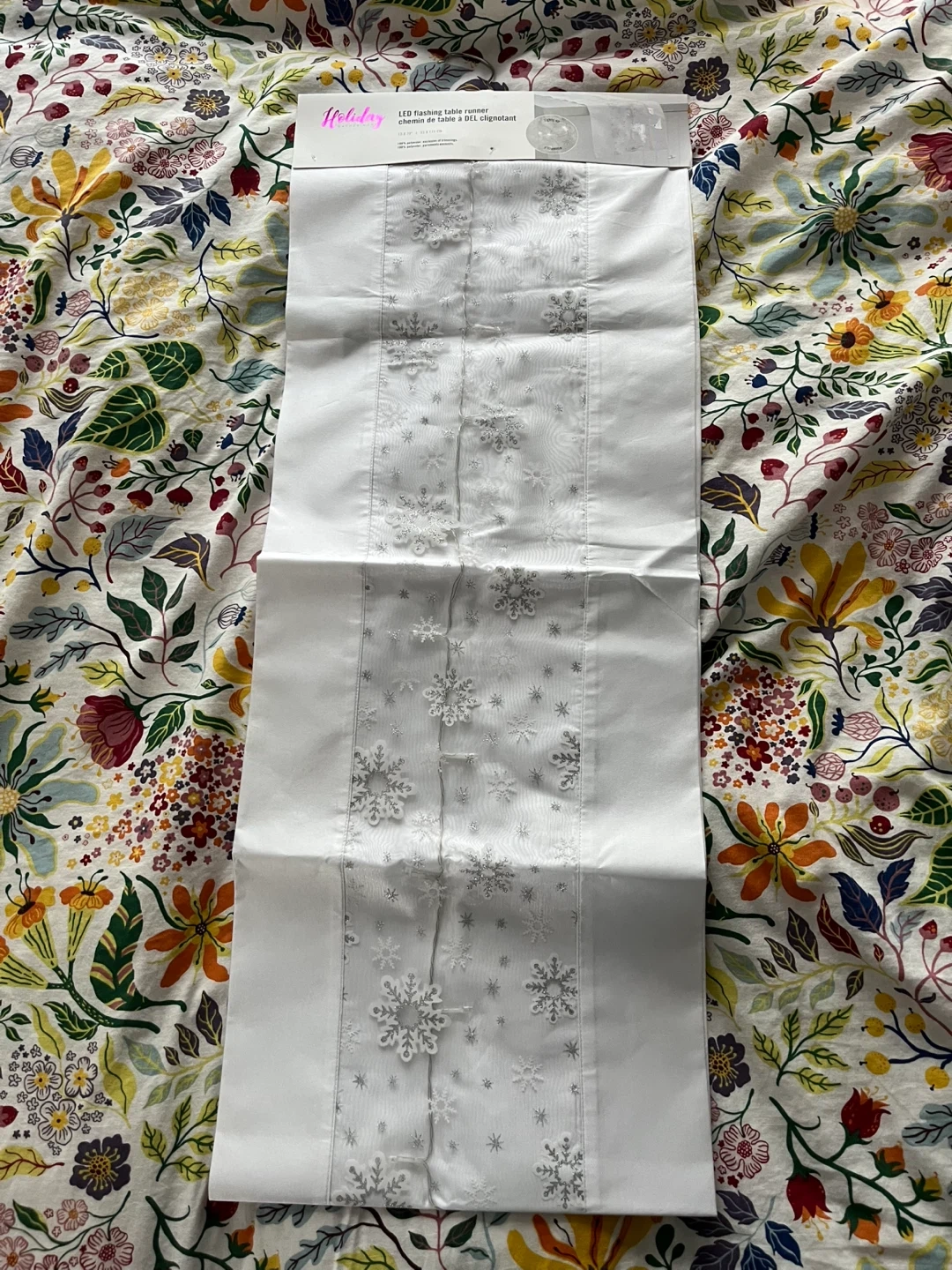 New in packaging holiday LED flashing table runner! It's white with silver snowflakes. The dimensions are 13 x 70 inches (33 x 175 cm). Perfect for adding a festive touch to your holiday decor
