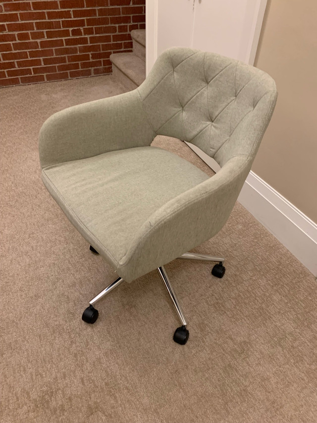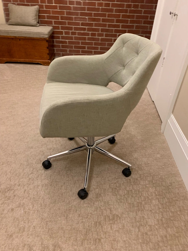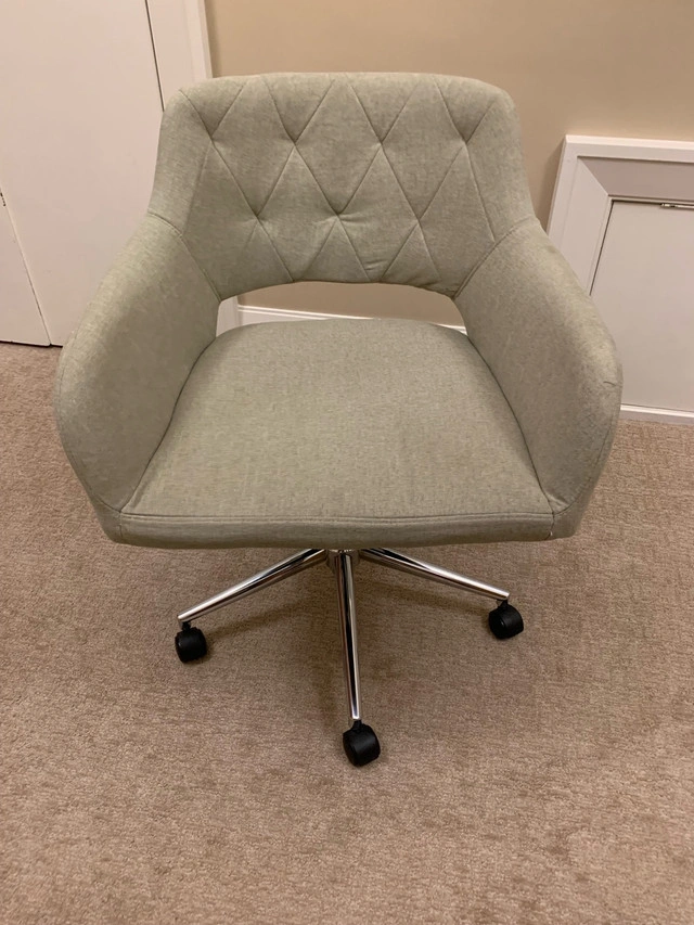 Add a touch of style to your workspace with this office chair! It features a comfortable, curved backrest with button-tufted detailing and sturdy chrome base with rolling casters. It's perfect for adding a pop of colour and personality to your home office or study. It is in good condition, and would look great in any office.