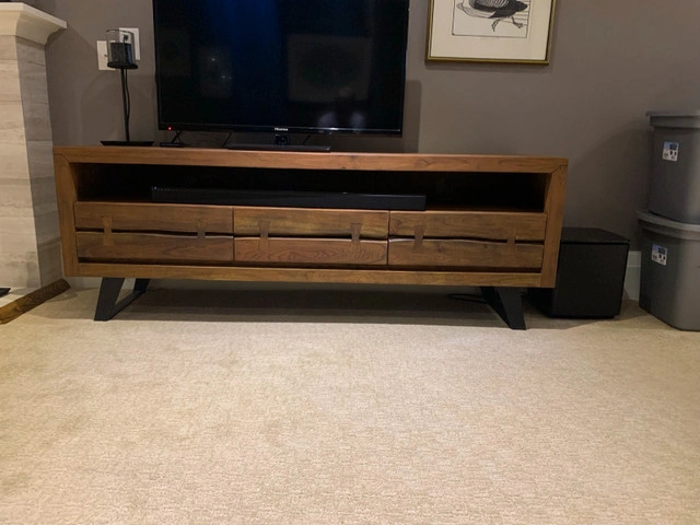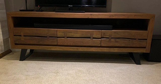 This is a stylish wood TV console, perfect for your living room setup. It is in excellent condition, offering both functionality and aesthetic appeal. The console features ample storage with drawers and an open shelf, ideal for media devices and accessories. This TV stand measures 69 inches long, 25 inches high and 18 inches deep. If the ad is up, it's still available!