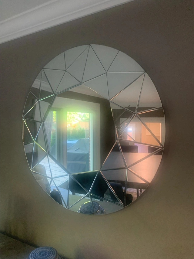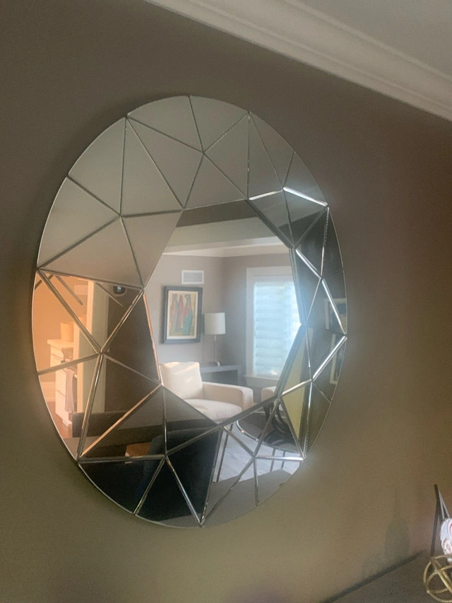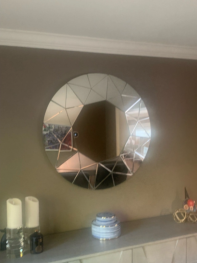 Add a touch of modern elegance to your space with this eye-catching geometric mirror, which features a unique multi-faceted design that reflects light beautifully. This mirror is in excellent condition, with no visible scratches or damage. It’s ready to hang and instantly elevate any room. Let me know if you're interested!