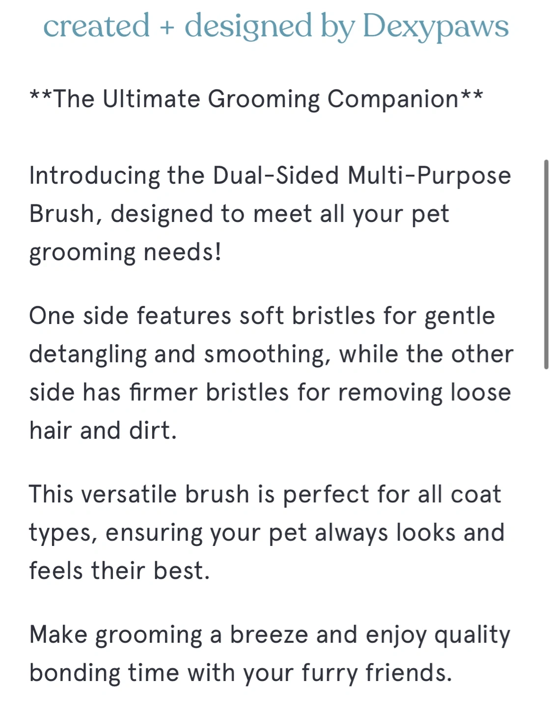 This is a Dexypaws dual-sided multi-purpose brush designed for dogs and cats. One side has soft bristles for gentle detangling and smoothing, while the other side has firmer bristles for removing loose hair and dirt. It's perfect for all coat types to ensure your pet always looks and feels their best!