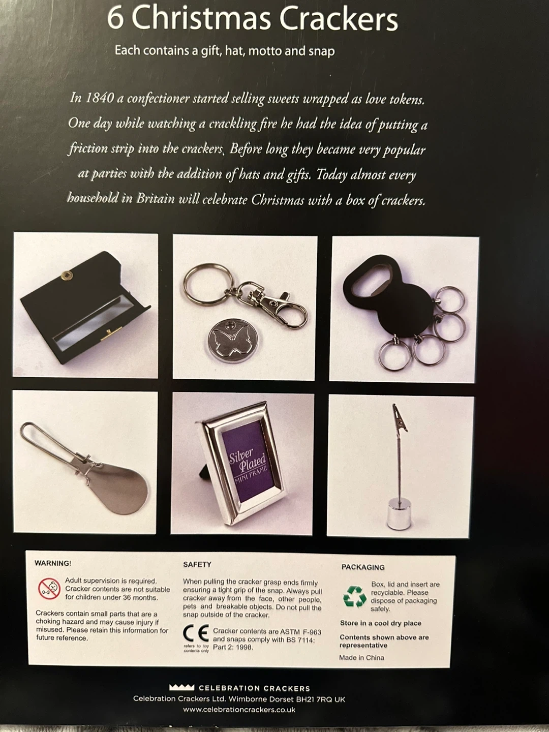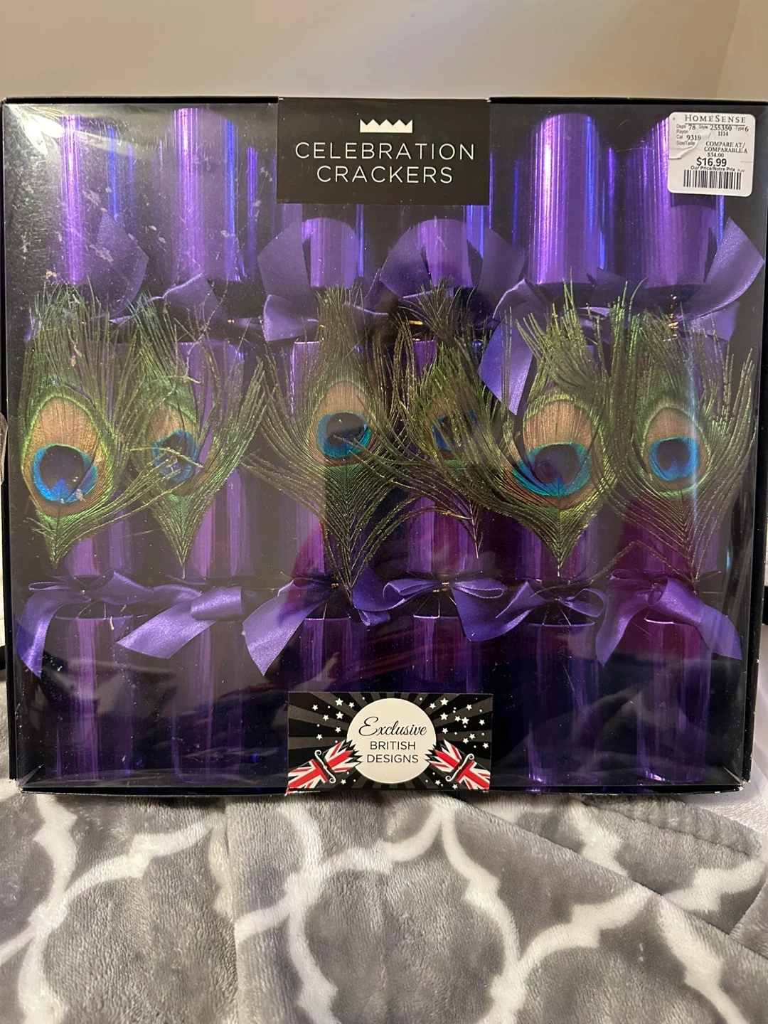 Selling a box of 6 Christmas Crackers by Celebration Crackers. These crackers each contain a gift, hat, motto, and snap! The box is in great condition and originally priced at $16.99 at Home Sense. Exclusive British Designs