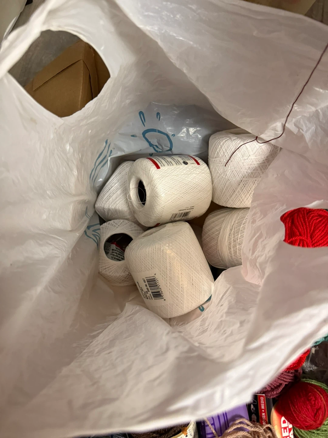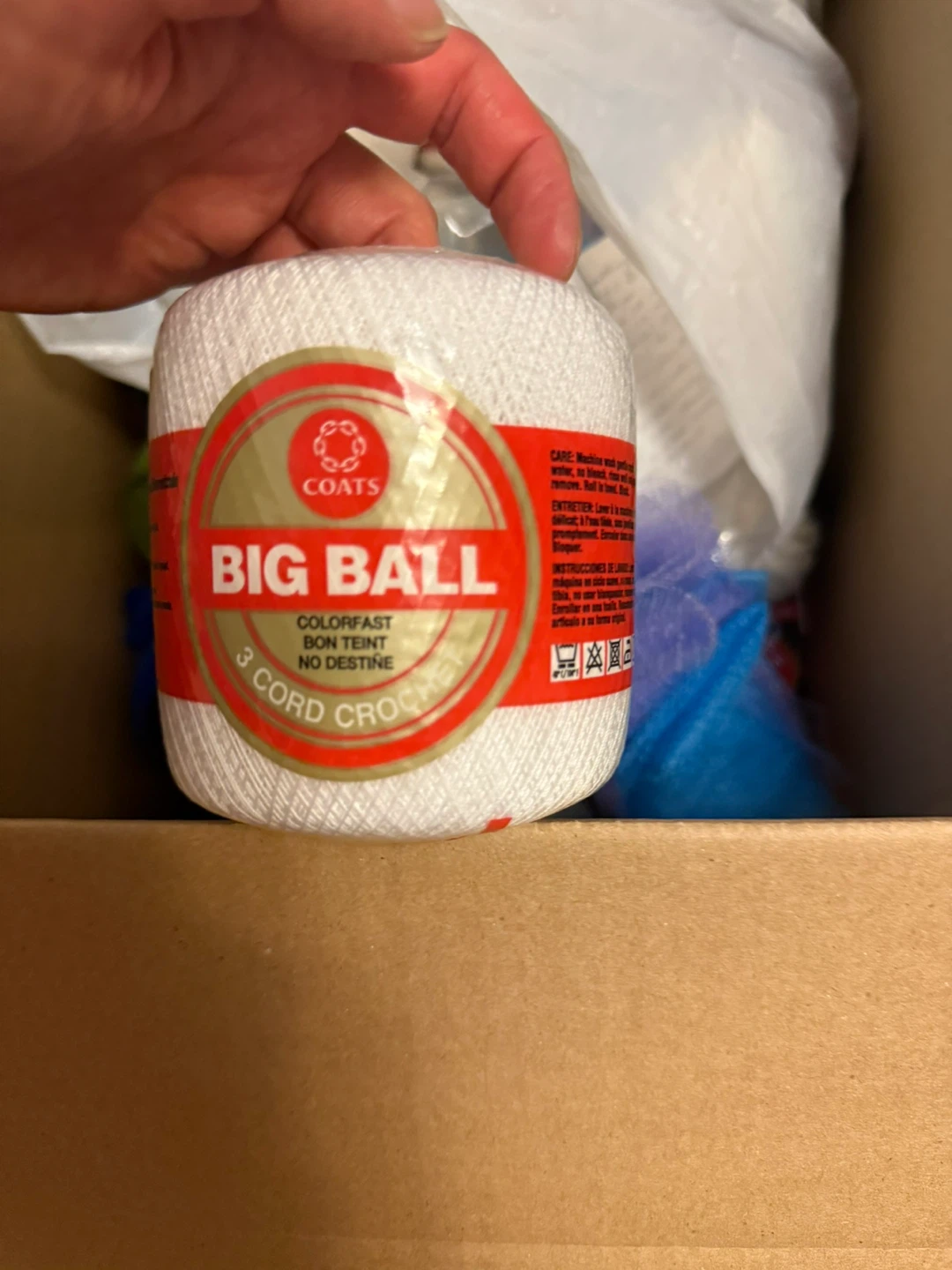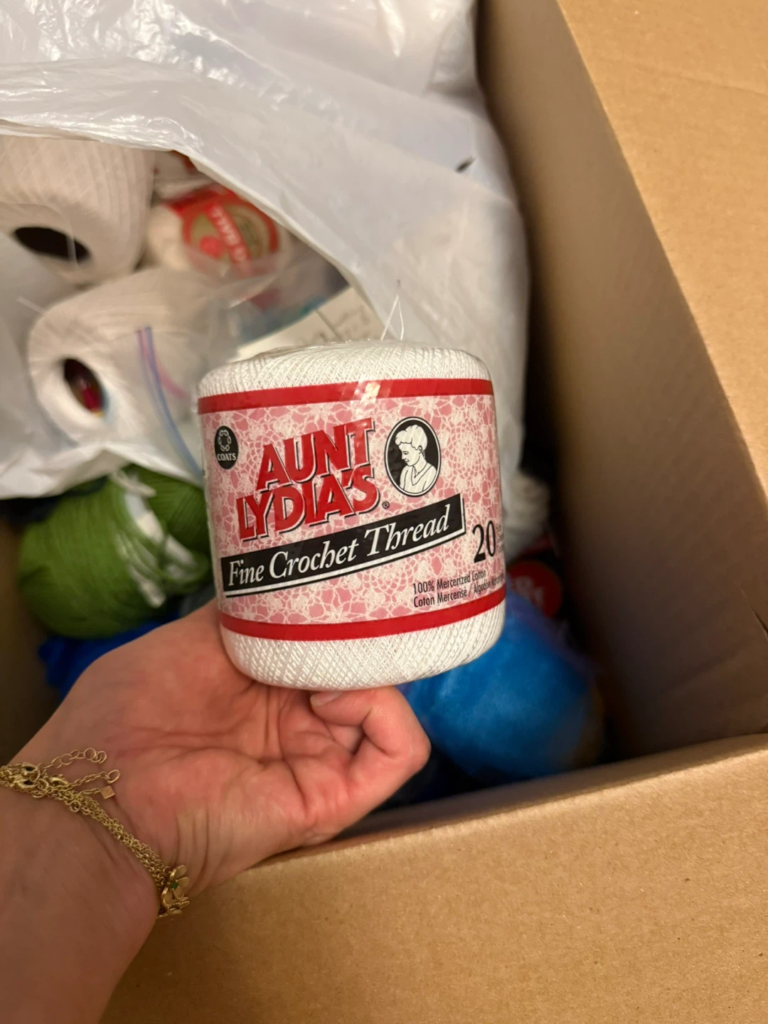 Selling a big box of yarn! There's a variety of colours and types, including some Aunt Lydia's Fine Crochet Thread and Coats Big Ball 3 Cord Crochet yarn. Perfect for all your crafting projects!