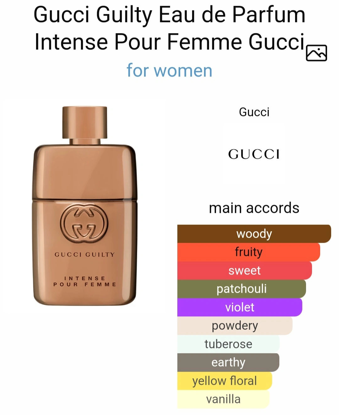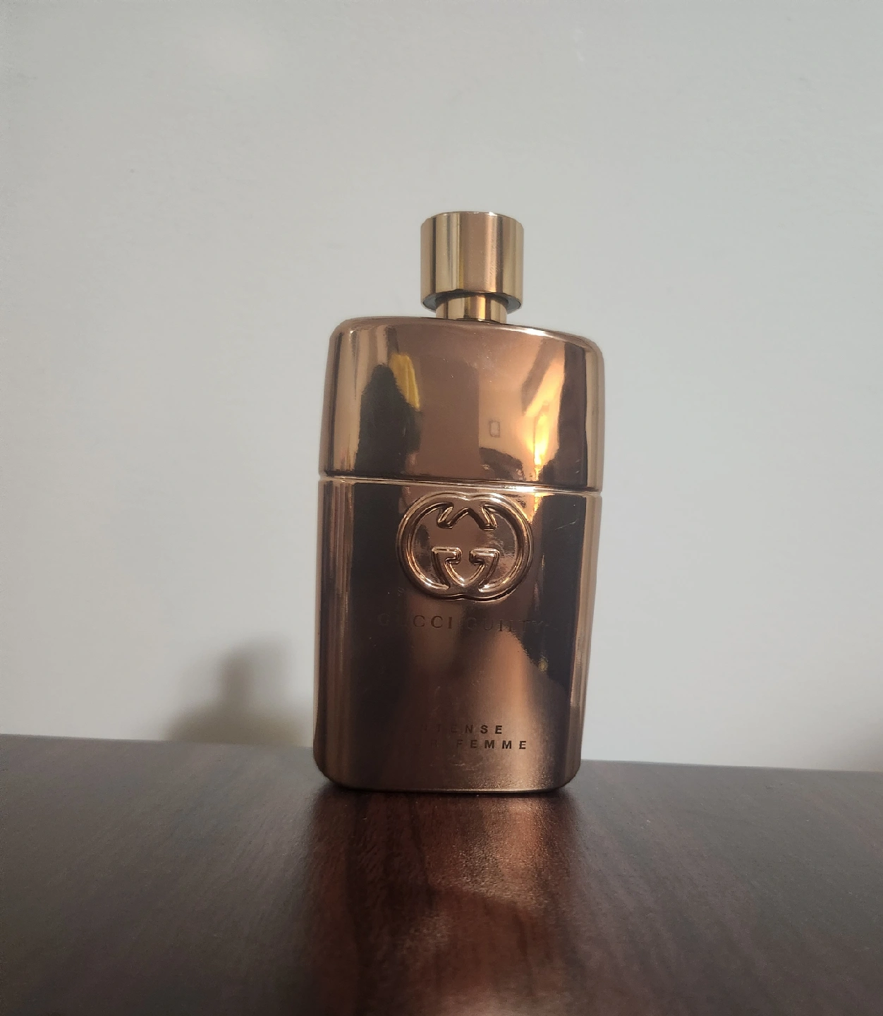 Authentic Gucci Guilty Intense Pour Femme Eau de Parfum in its sleek golden-toned bottle with bold, luxurious design. This fragrance is sensual, warm, and powerful with a rich blend of amber, floral, and spicy notes—perfect for evenings out or a confident signature scent.