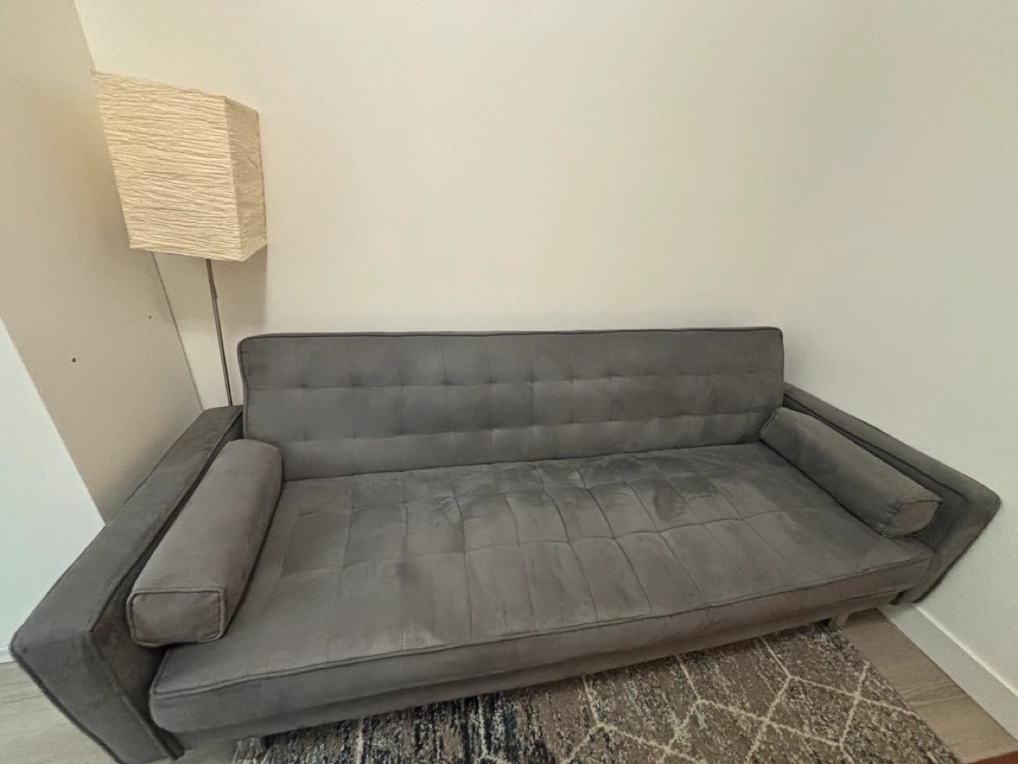 Selling a grey sofa bed. It's in good condition and would be a great addition to any living space. The sofa folds out. Pickup only. Free lamp ๐