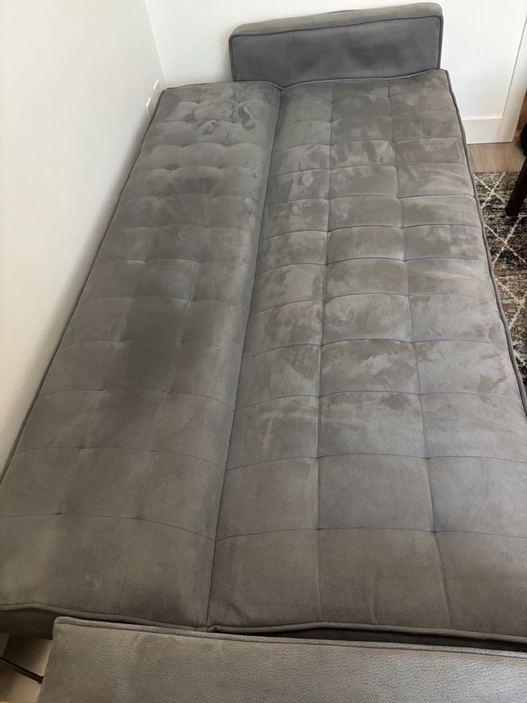 The couch has no damage, just a couple of minor stains that are barely noticeable, a dry cleaning might help. It opens into a bed that is a bit smaller than queen size. Iโm located in the Chinatown area of Vancouver.