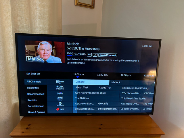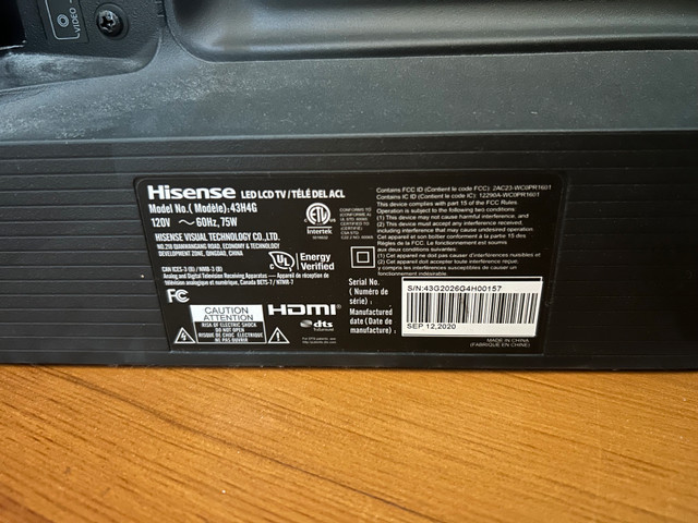 I'm selling my used 43-inch Hisense Roku TV, which delivers a crisp and clear picture for all your favourite shows and movies. This Hisense TV comes equipped with the Roku smart platform built in, giving you access to thousands of streaming channels! This television is in great working condition. Additional specifications include: * Screen Size: 43 in with remote -legs not included * Smart TV: Roku TV * Resolution: Full HD (1920 x 1080) * Ports: HDMI, USB, Composite