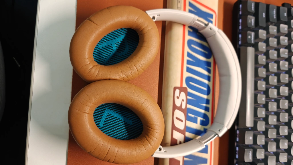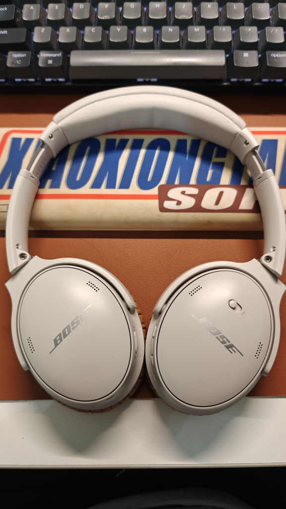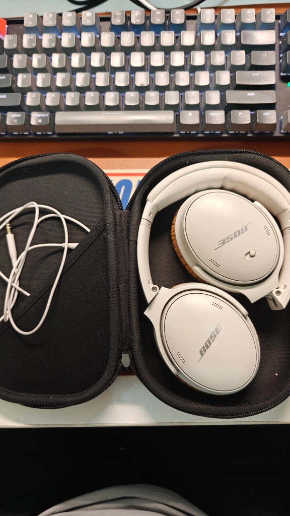 Selling a pair of Bose QuietComfort 45 wireless headphones in silver. They come with a case and a cable. There are some signs of wear on the headband, but the earcups are in good condition. Perfect for travel or everyday use!