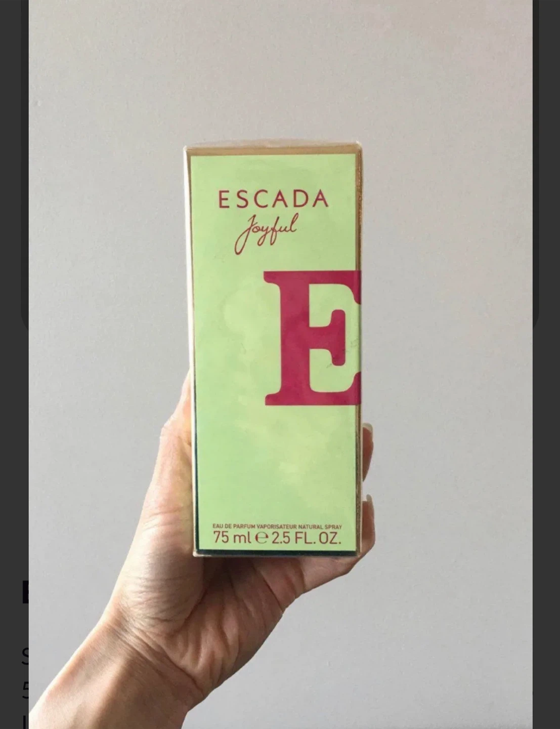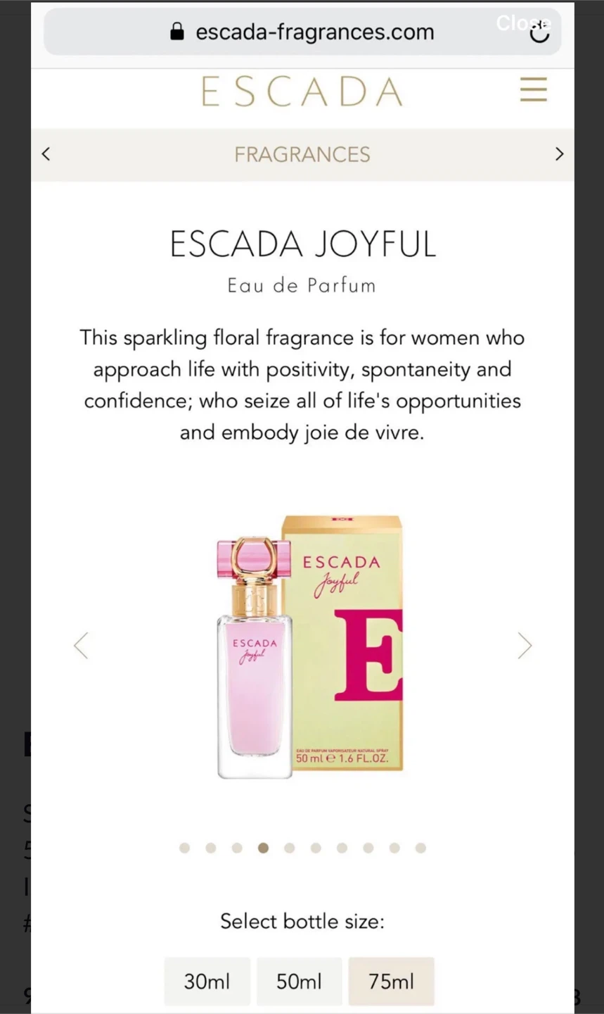 1 / 21 / 2Buy & SellNEW Escada Joyful Eau de Parfum 75mlNEW Escada Joyful Eau de Parfum 75ml$35Sealed in original packagingConditionNewBrandEscadaWHERE TO MEETCheck LocationView MapSELLERJaclynOld Toronto24323 reviews0 chats·2 favorites·36 viewsSEND CHAT TO SELLERHi Jaclyn! I’m interested in your listing.Hi Jaclyn! I’m interested in your listing.Get the Karrot app to chatSign In to chat