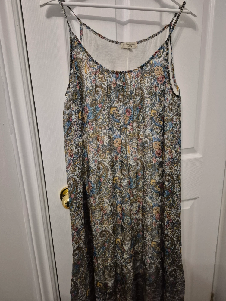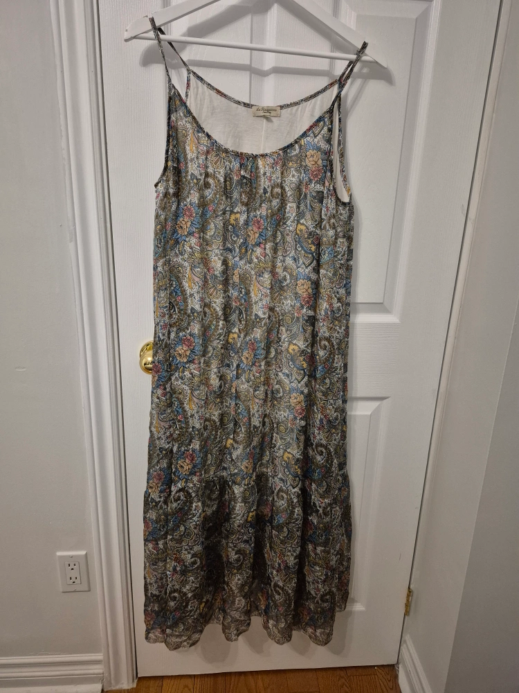 This La Notte Bianca silk moomoo dress features a beautiful floral print. It's a flowy, lightweight dress, perfect for summer days and vacation (thin or pregnant it fits and looks great). The material feels soft and comfortable against the skin with a cotton liner It's in great condition and ready for a new home!