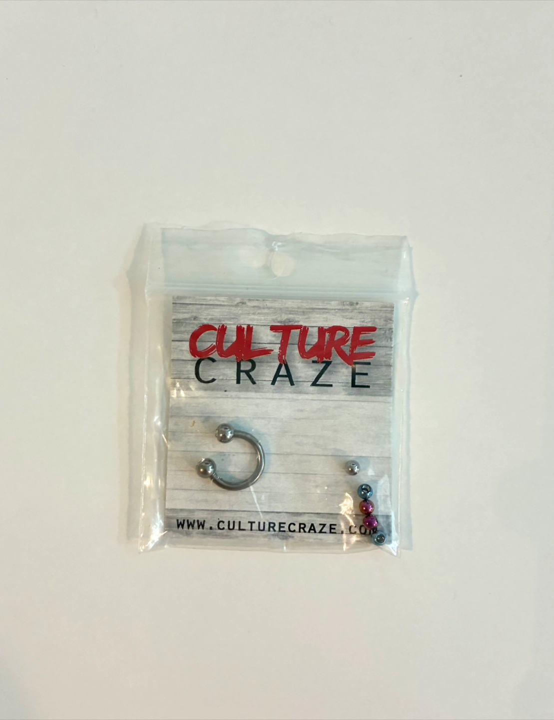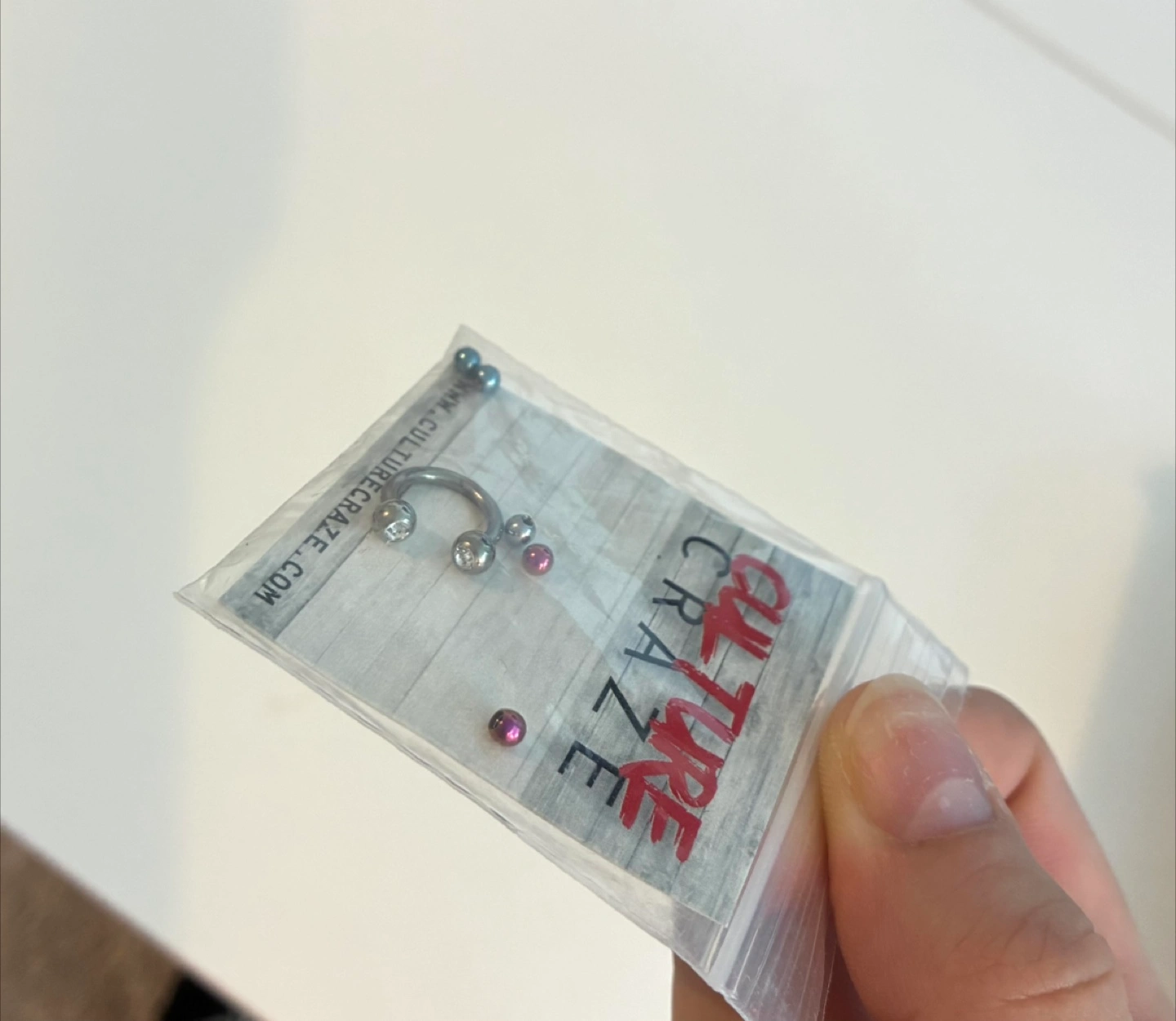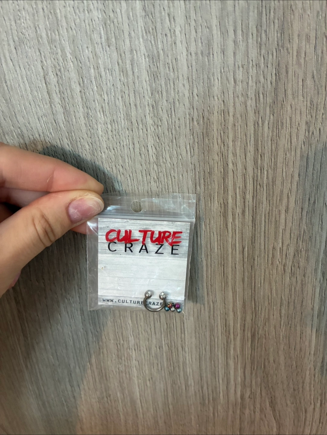 Never been used. I believe the gauge size is 16, but it doesn’t say on the package so I’m not 100% certain. The material is stainless steel. Comes with 5 extra screw-on balls.