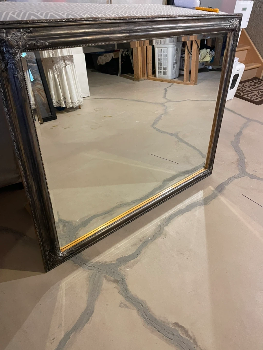 Selling a large framed mirror with a beautiful ornate design. The frame has a dark, antiqued finish. It measures approximately 35.5 inches by 45.5 inches. Perfect for adding a touch of elegance to any room!