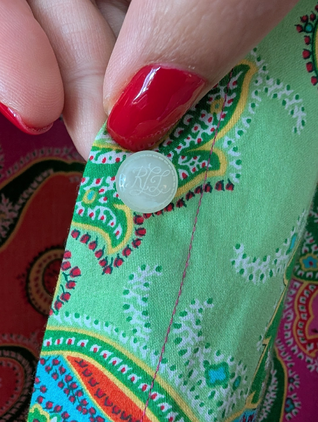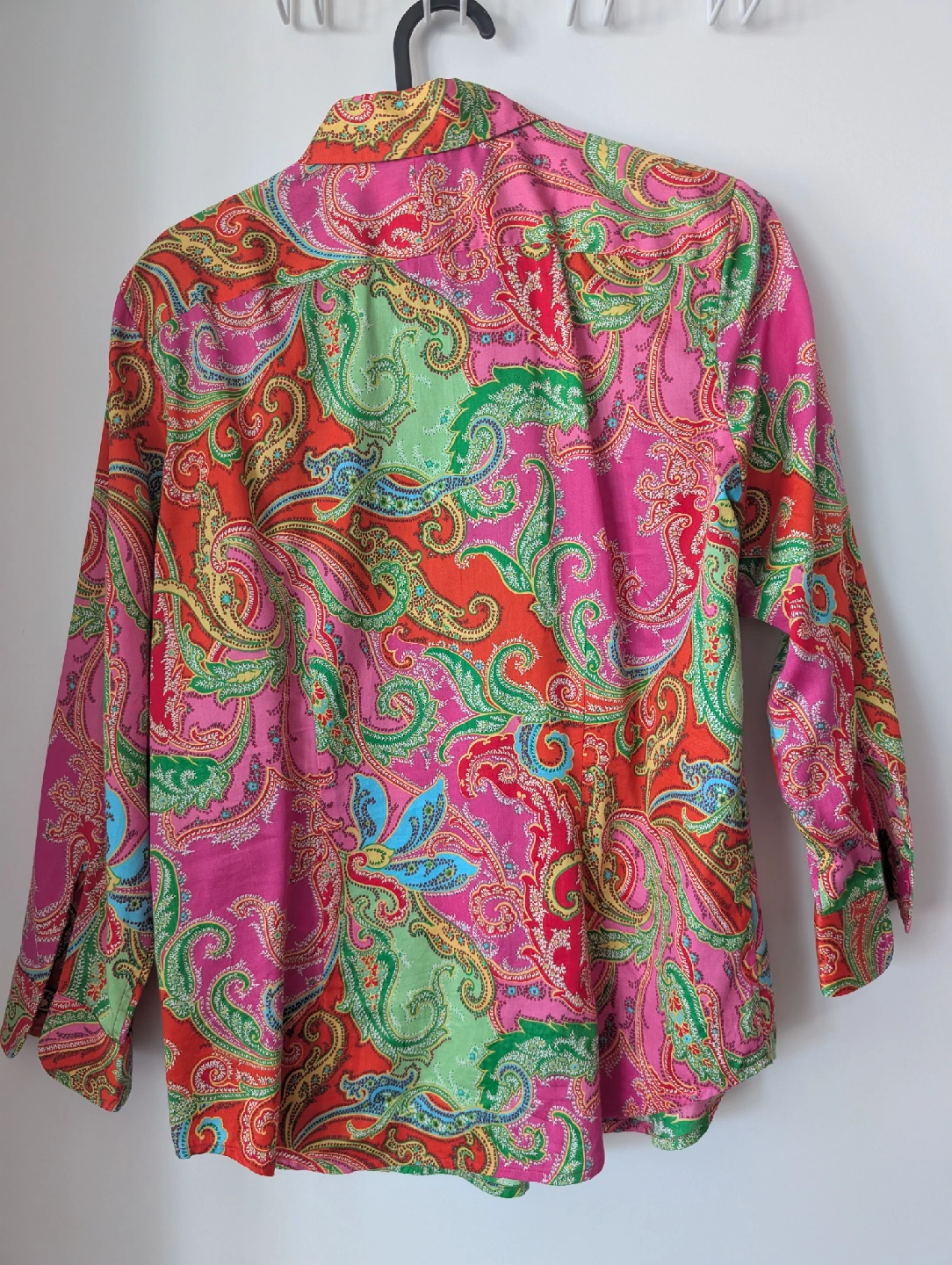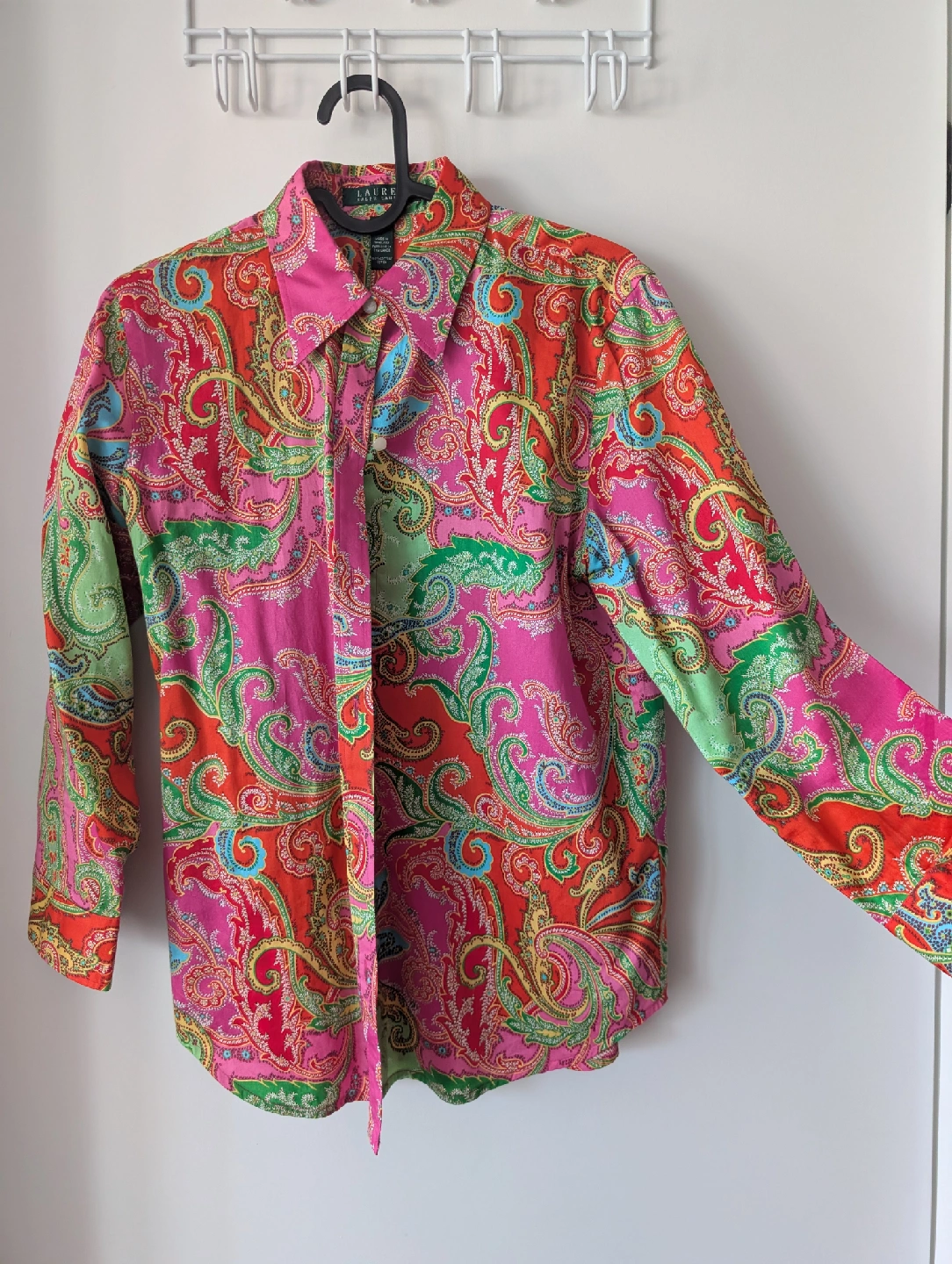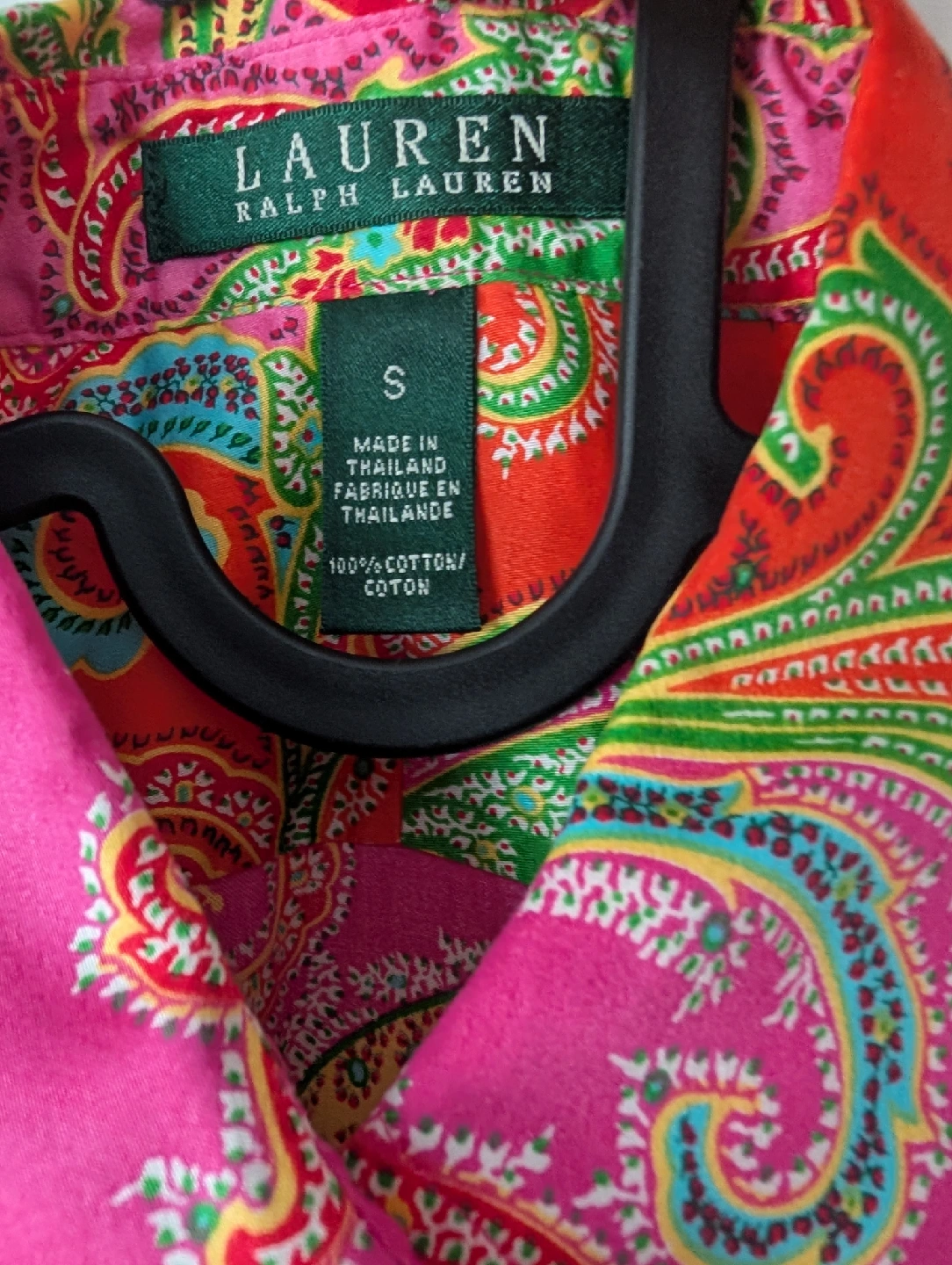 Selling a Lauren Ralph Lauren button-up shirt in size small! It features a vibrant paisley print in shades of pink, green, orange, and blue. The shirt is made of 100% cotton, making it super comfy and breathable. The buttons are also quite detailed and lovely. Sleeves are 3/4 in length.